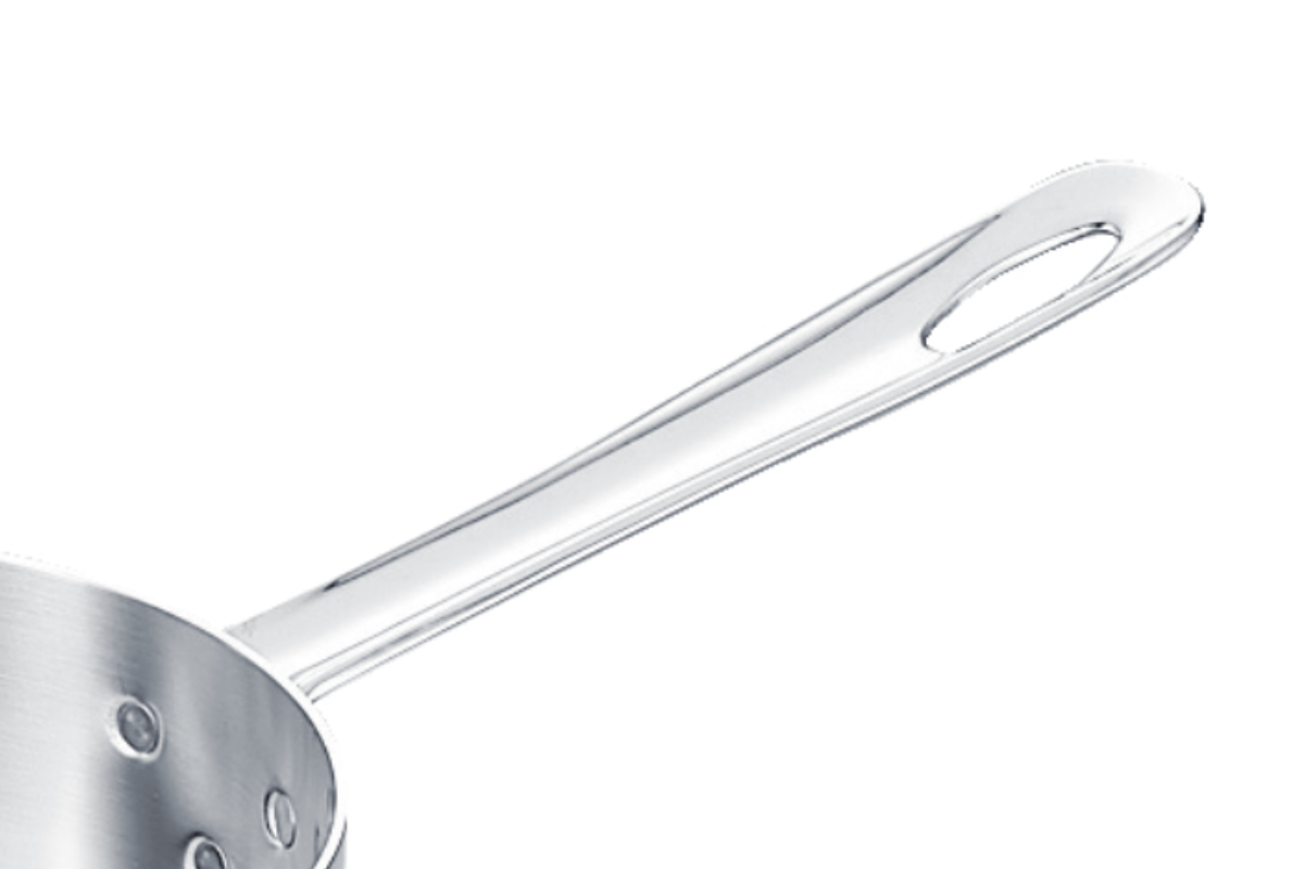 ステンレスの間にアルミを挟んだ全面3層構造です。IHクッキングヒーターに接する外側は有磁性に優れたステンレス(SUS430)を使用しているので、熱効率に優れています。また、発生した熱を内部のアルミが素早く均一に伝えるので、スピィーディに美味しく調理できます。