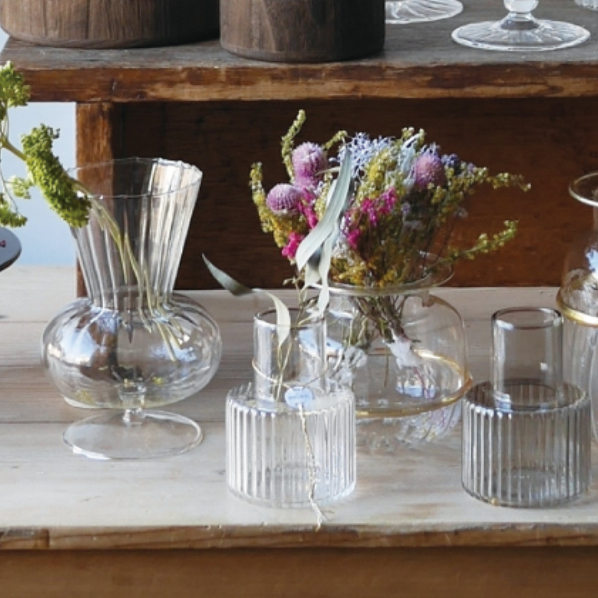 ゴールドのふちがポイントの一輪挿しです。シンプルなデザインなので、お庭で摘んだ草花でも素敵に飾ることができます。繊細で清楚なガラスのデザインは、どんなお部屋にも調和します。