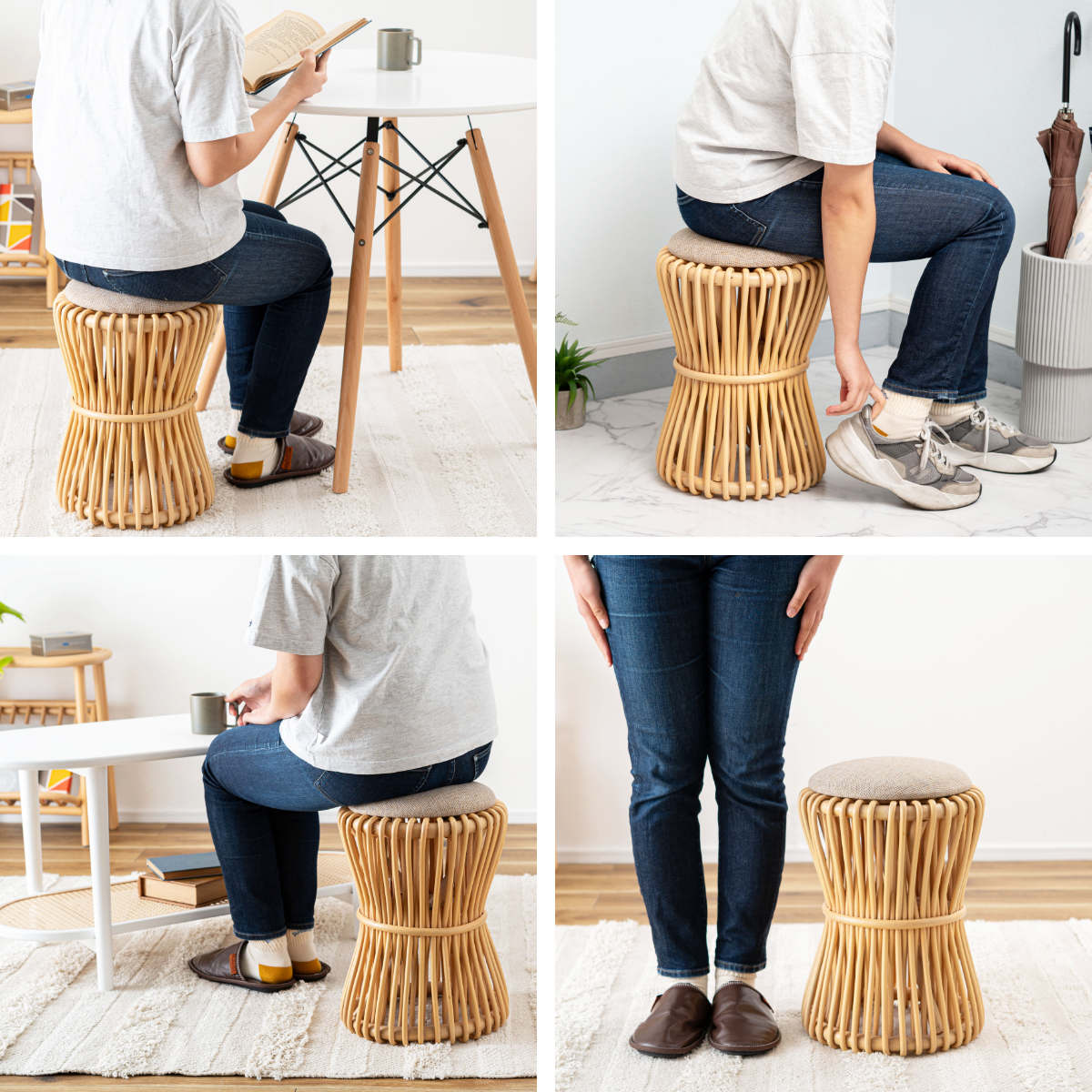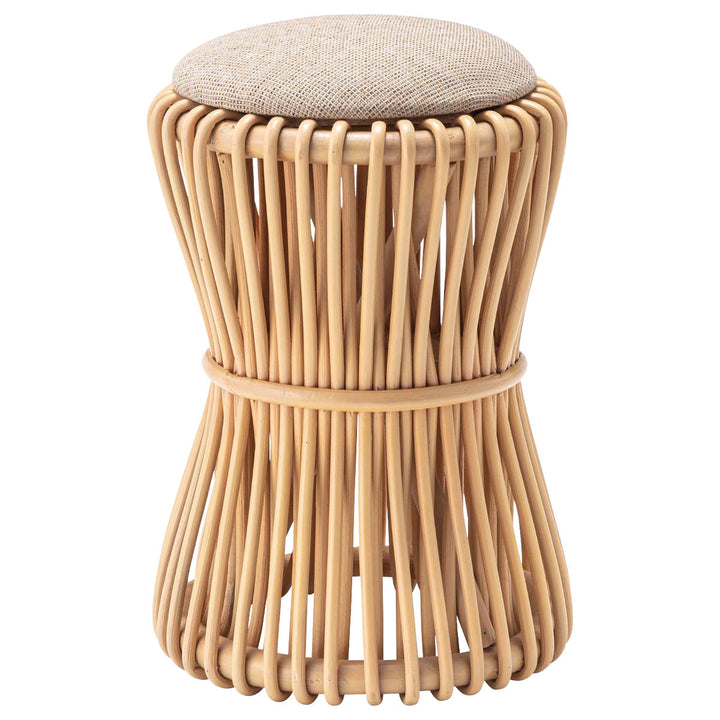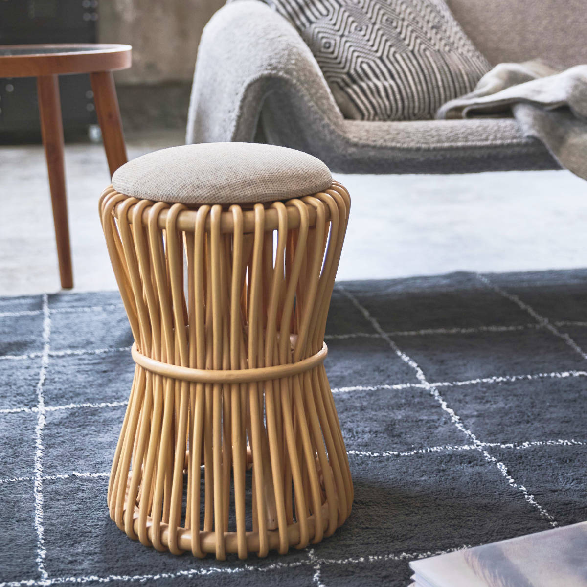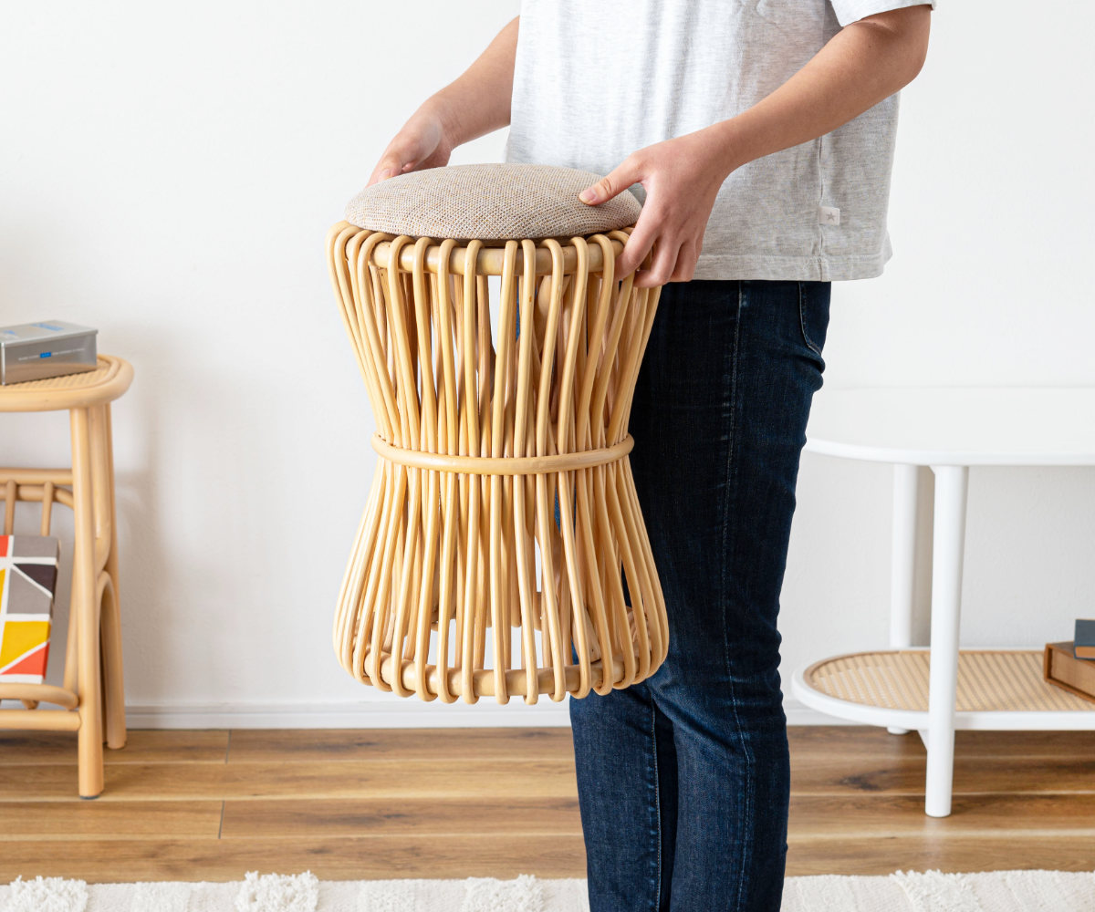 天然ラタンを使用した、鼓(つづみ)のようなフォルムが可愛いスツールです。編みを生かした抜け感のある独創的なデザインが特長です。天然ラタンは、ひとつひとつ個体差があり、違った表情を楽しめます。