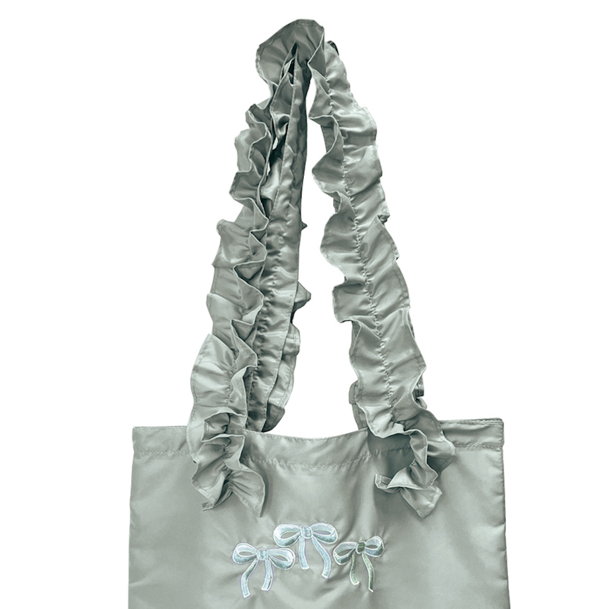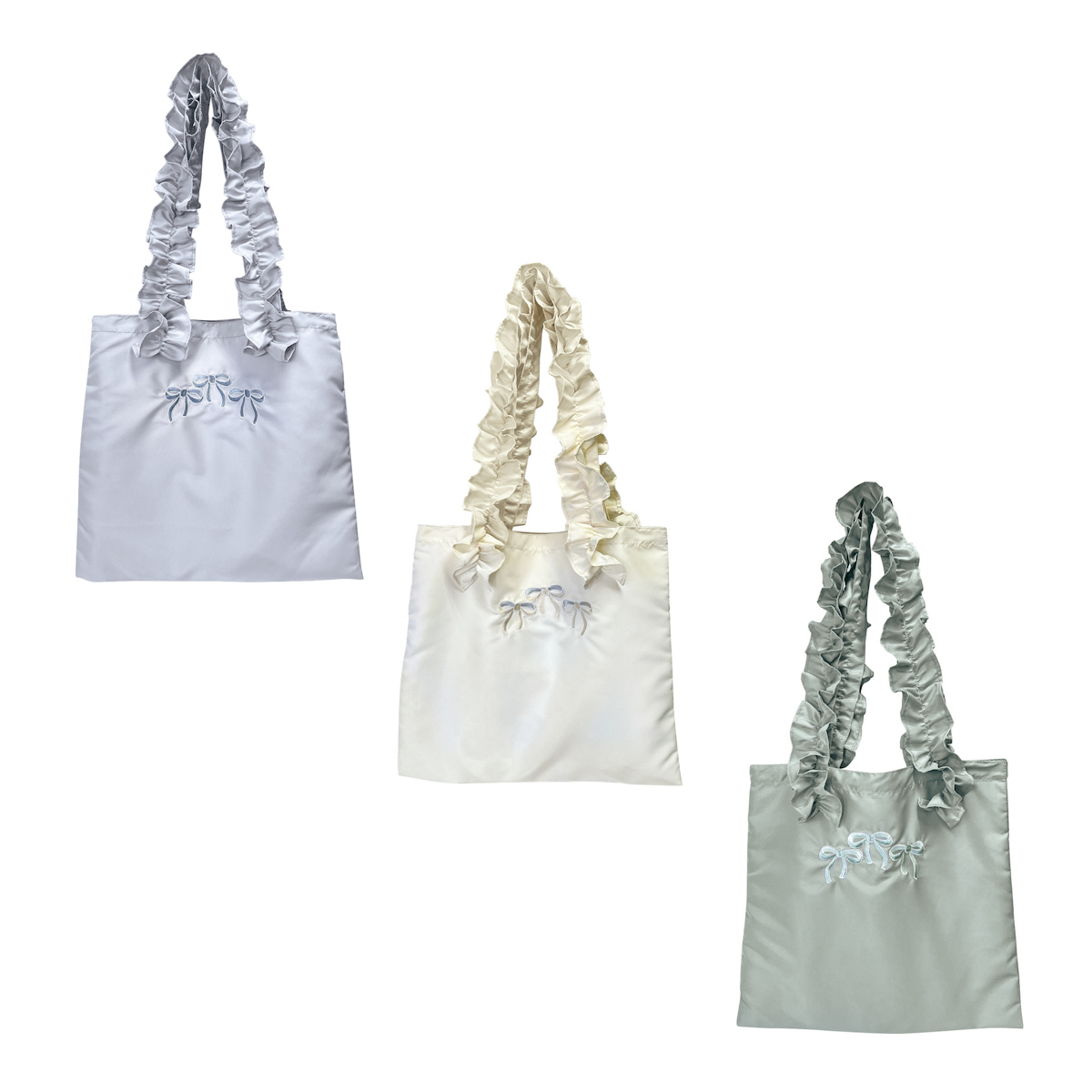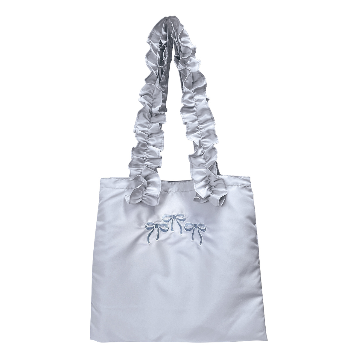 持ち手のフリルが目を惹くトートバッグです。バッグにはリボン柄の刺繍が入っており、可愛さと上品さも兼ね備えたお洒落なアイテムです。A4サイズ対応なので、通勤通学にもおすすめです。