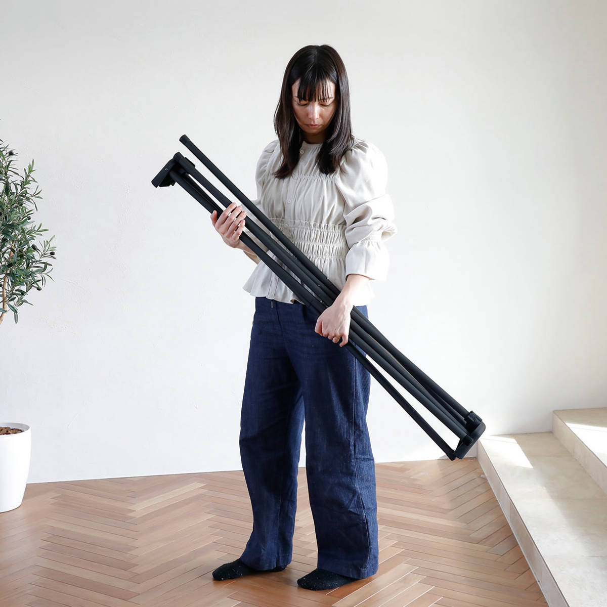 収納時は4本の脚を折り畳むだけでコンパクトになり、ちょっとしたスペースに置けます。使いたいときは脚を広げるだけですぐに使えます。