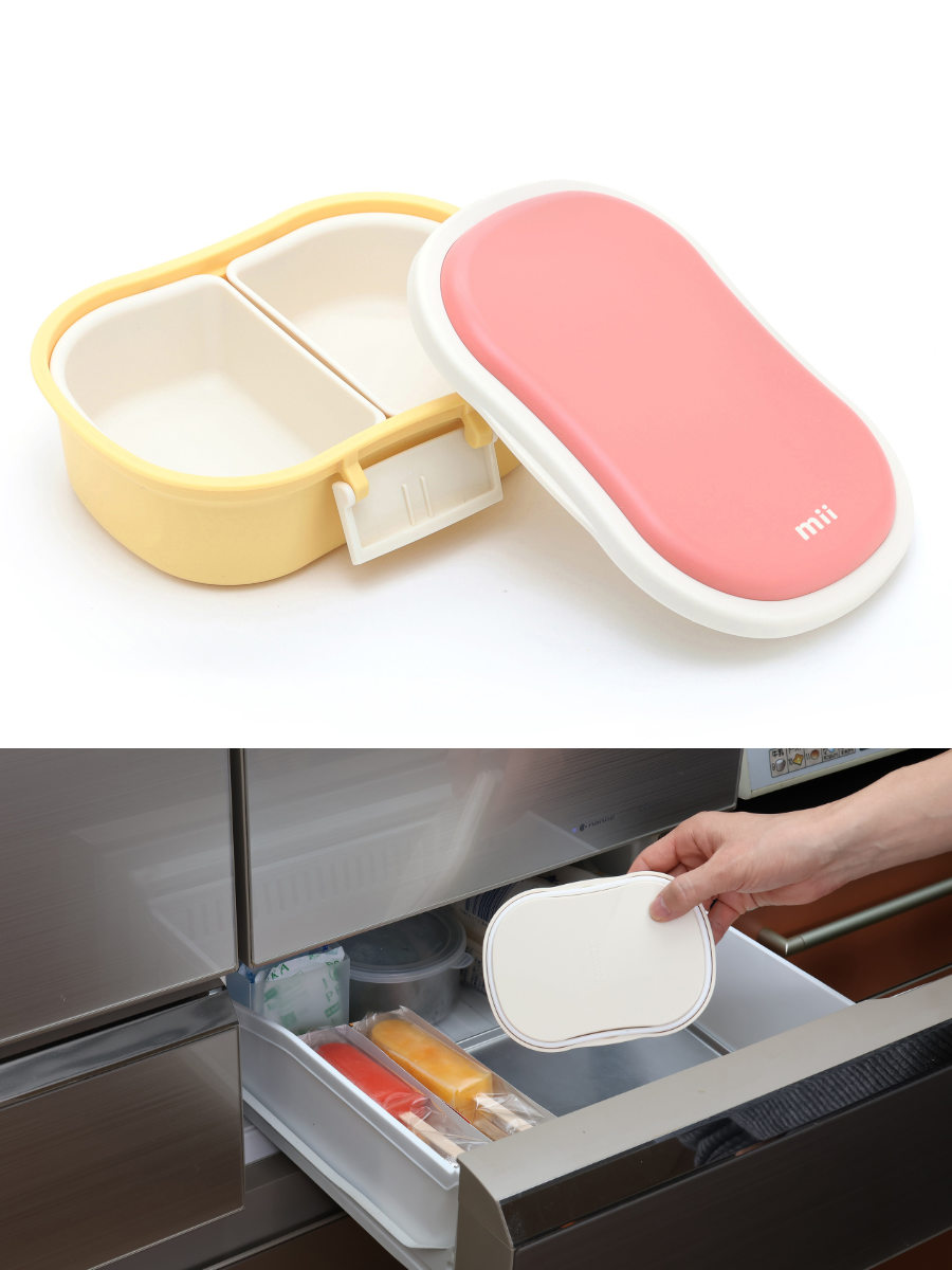 蓋が保冷剤と一体になっているお弁当箱です。保冷の準備は蓋を冷凍庫に入れておくだけです。使うときにお弁当箱にセットするだけなので保冷剤を入れ忘れる心配もありません。暑い時期はもちろん、オールシーズンしっかり保冷できて安心です。蓋は洗って、くり返しお使いいただけます。