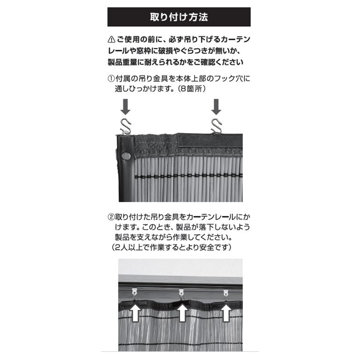 工具不要で、付属の吊り金具を本体上部のフック穴に通して、お使いのカーテンレールに簡単に取り付けできます。