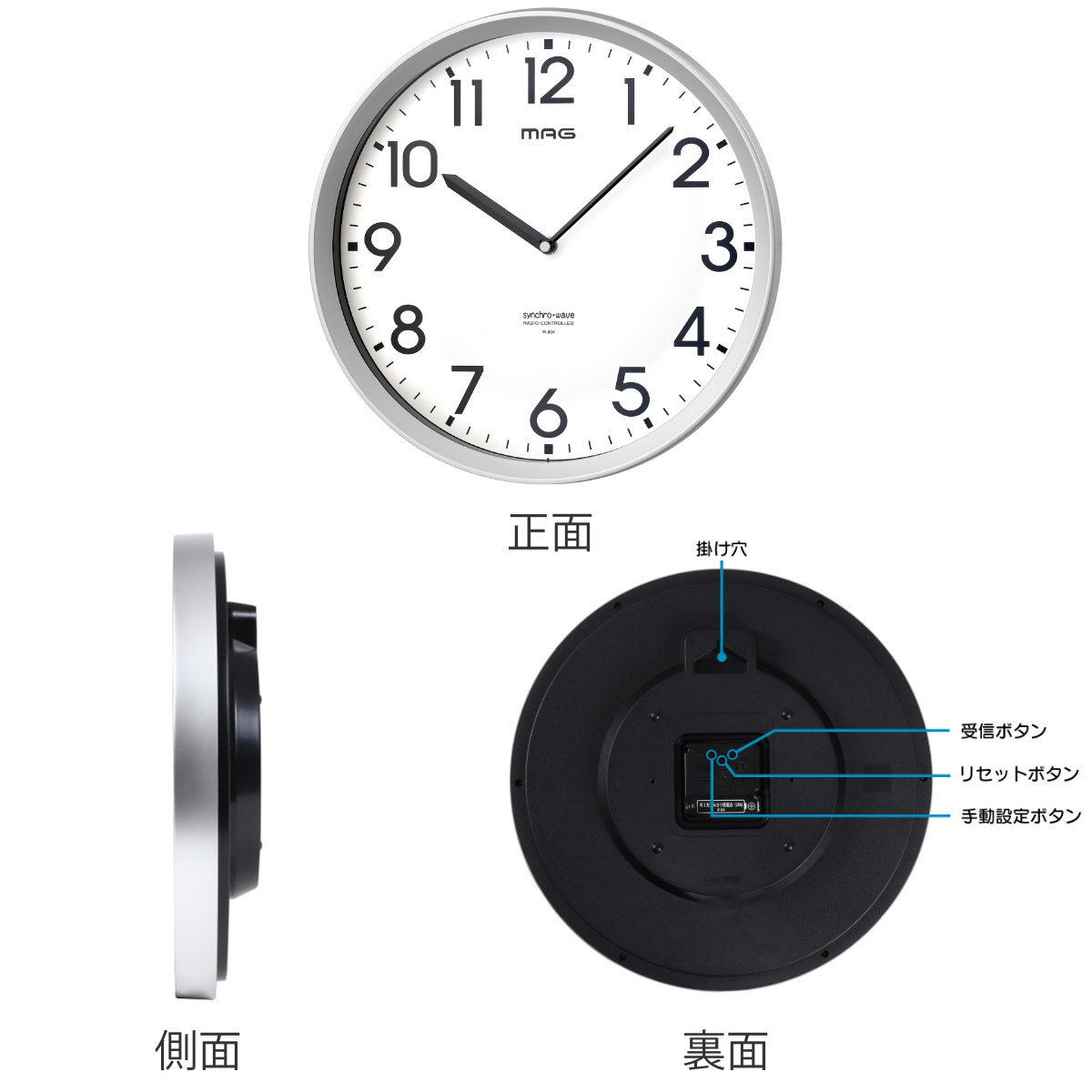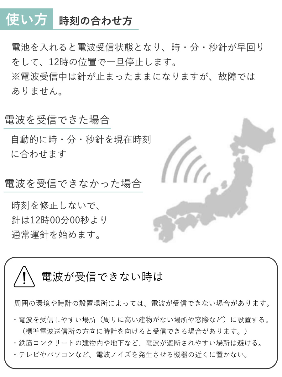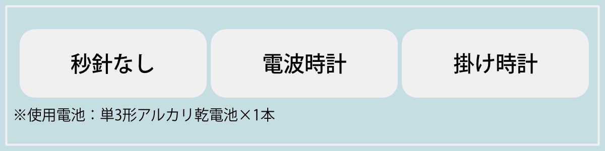 | 注意事項 | ※秒針がなくても内部のクォーツ振動子が一定のリズムで動作しているため、カチカチという音が聞こえることがあります |