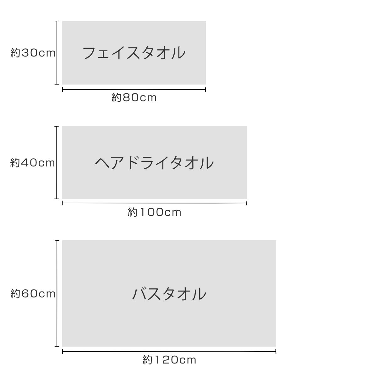 フェイスタオル、ヘアドライタオル、バスタオルの3サイズをご用意しています。日常使いからお出かけ用まで様々なシーンに合わせてご使用いただけます。