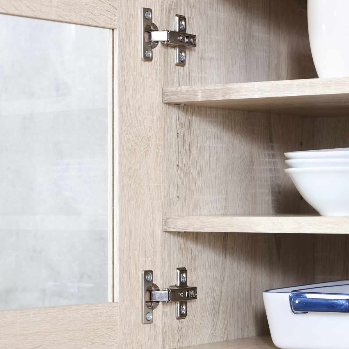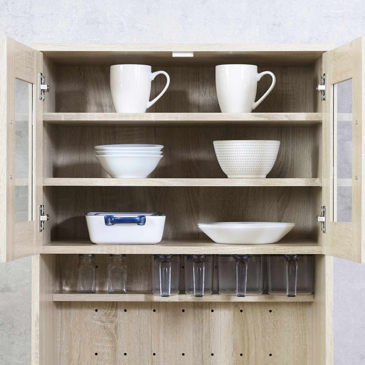 上段は両開きの開き戸で、大きめの食器も出し入れがスムーズに行えます。ガラス扉なので、中の物が一目でわかり取り出しやすく、使わない時は食器をホコリから守ることができます。