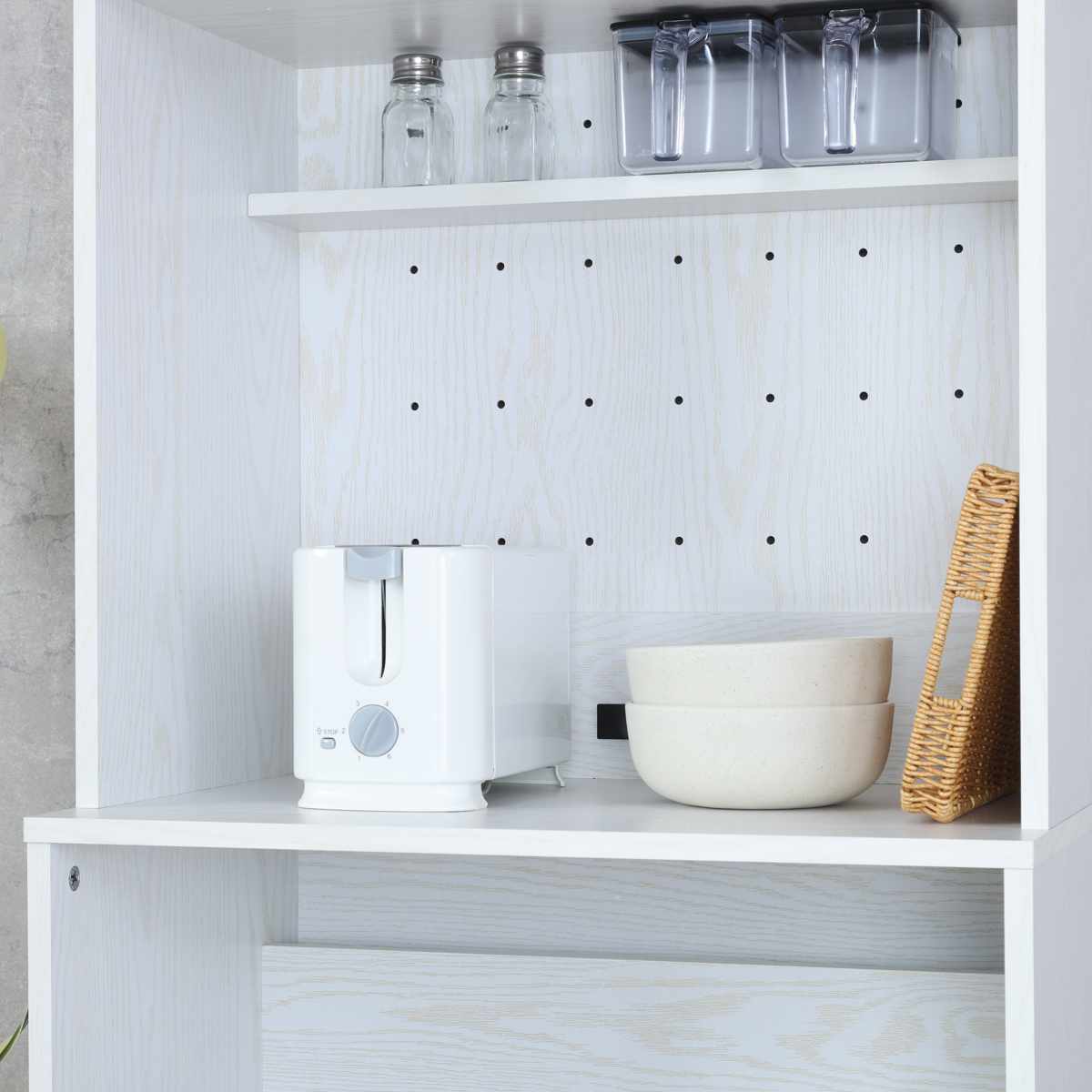 中段のオープンスペースはキッチン家電の設置にぴったりです。背板に有孔ボードを使用しているので、湿気や蒸気がこもる心配がありません。棚付きなので、調味料などを置くこともできます。調理の準備がしやすい高さで、作業台としてもお使いいただけます。