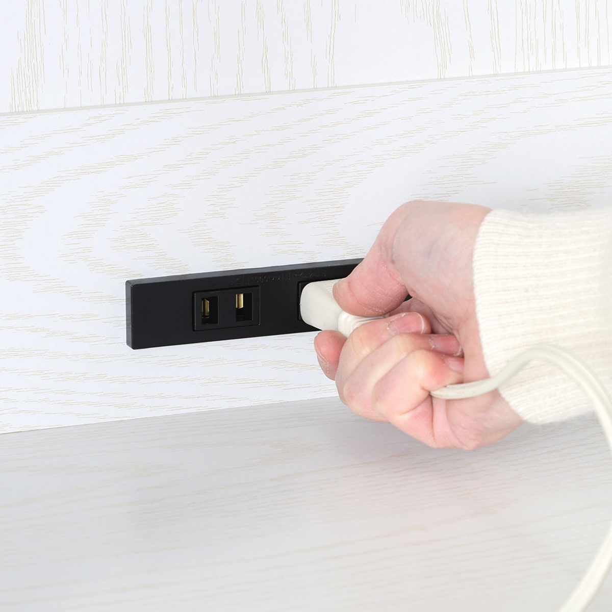 オープン収納の背板には2口コンセントが付いているので、家電製品の配線がキレイに収まります。