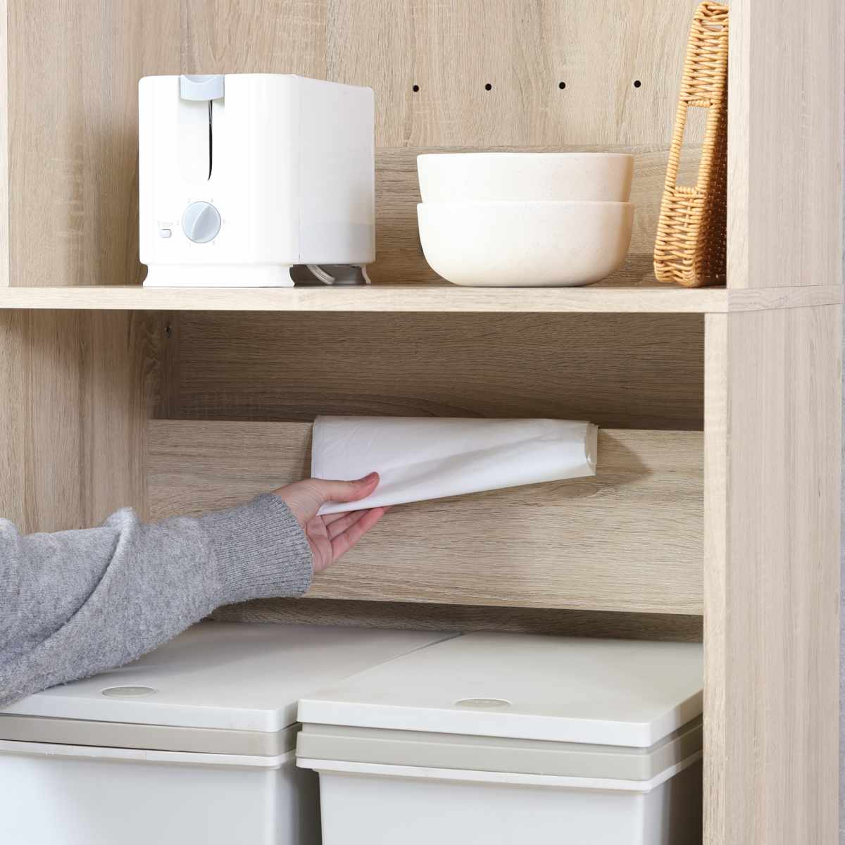 下段の奥のスペースには、ゴミ袋のストックを置くことができるので、袋の交換がスムーズに行えます。