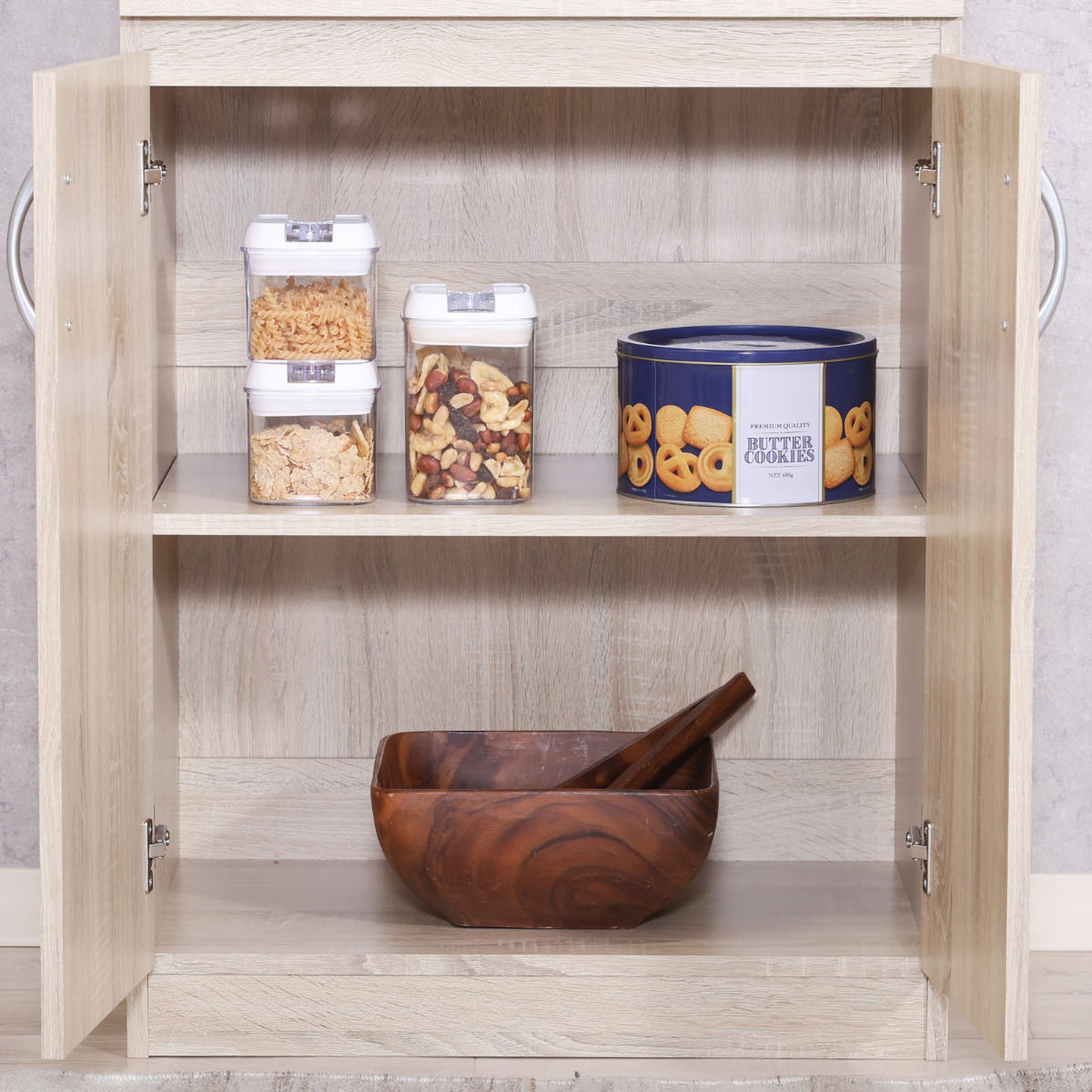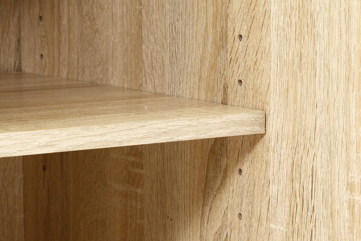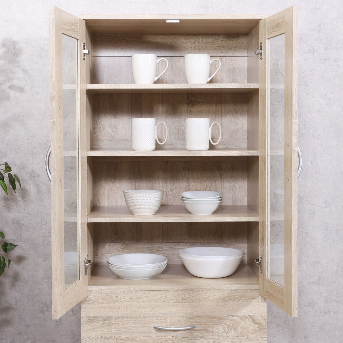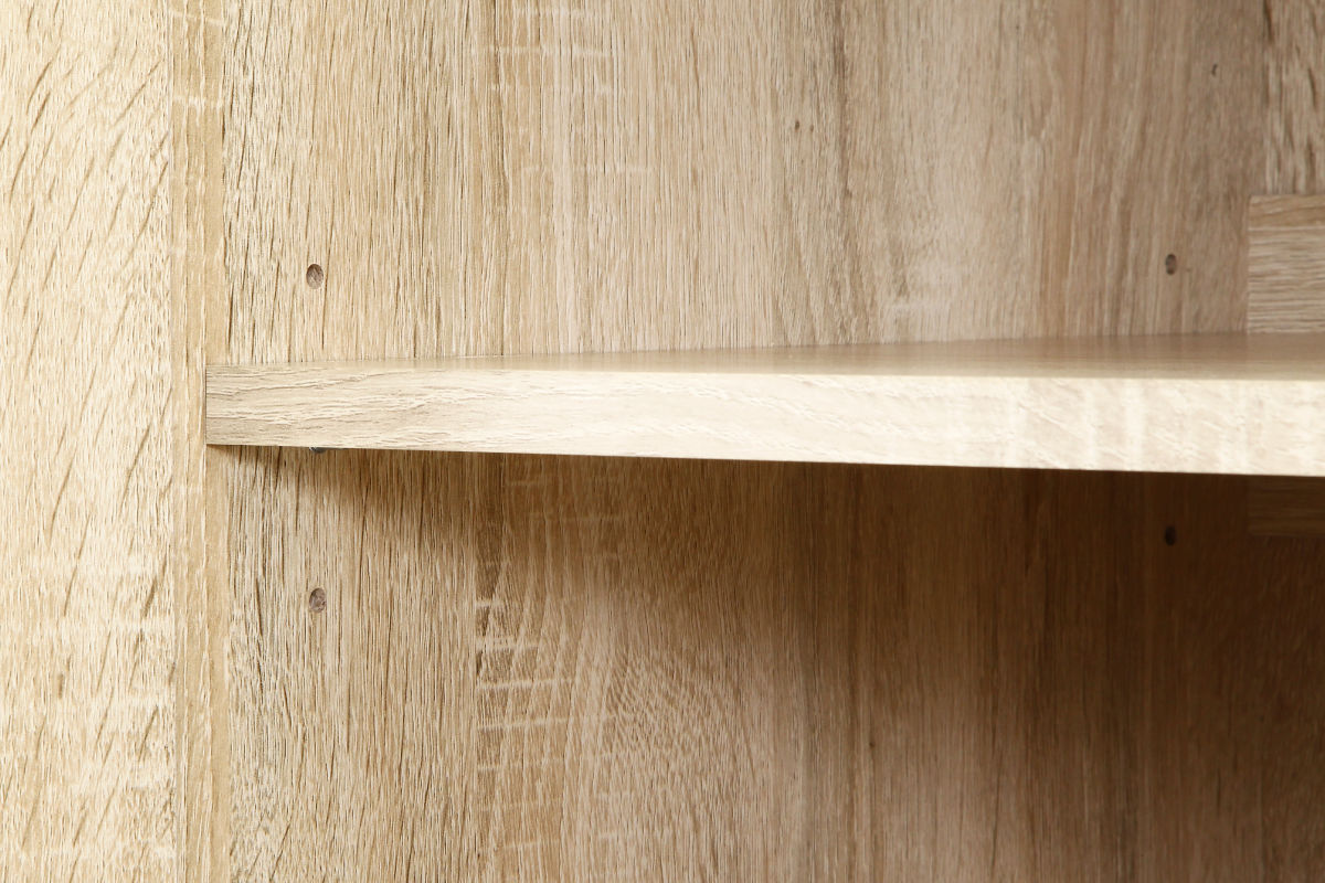 高さを最大限に活かした、コンパクトながら大容量のキャビネットです。食器や調理器具をまとめてスッキリと整理できます。木目調の温かみのあるベーシックなデザインでお部屋に馴染み、狭いスペースにもフィットします。