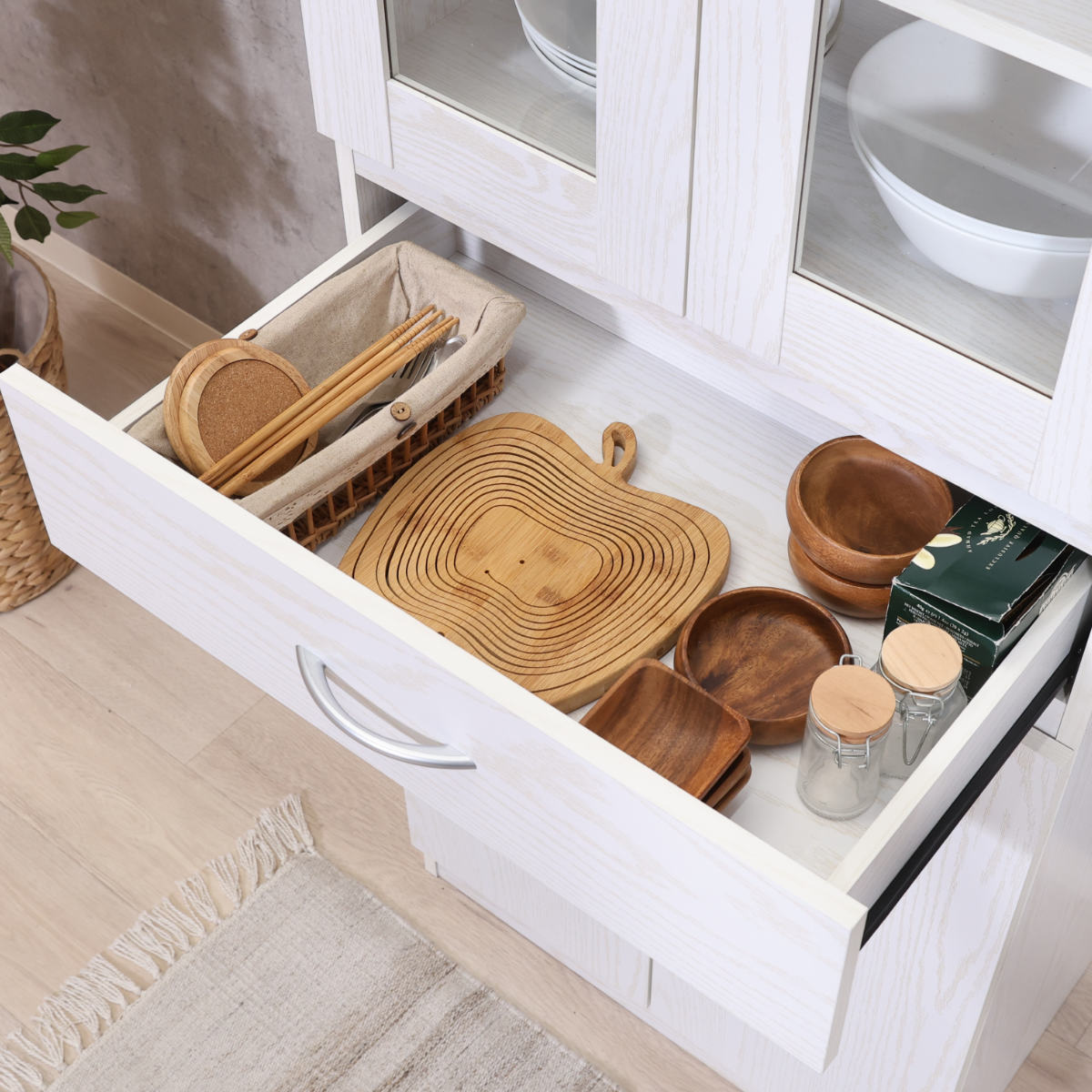 上部はガラスの扉で、中身が見やすく取り出しやすい高さです。お気に入りの食器を魅せることもでき、扉がホコリや汚れから守ってくれます。収納するものに合わせて高さが調整できる可動棚が3枚付いています。