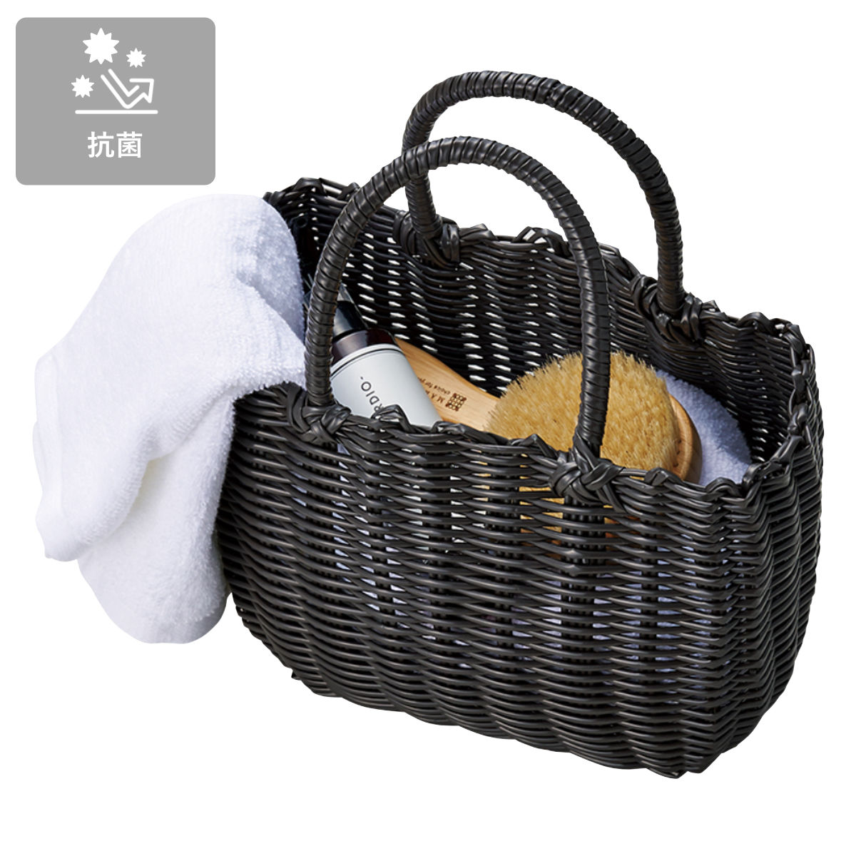 抗菌素材を使用した、洗えるかごバッグです。水に強く丸洗いが可能です。濡れてもよい素材なので安心して使用でき、宿泊施設様の湯かごバッグにもおすすめです。