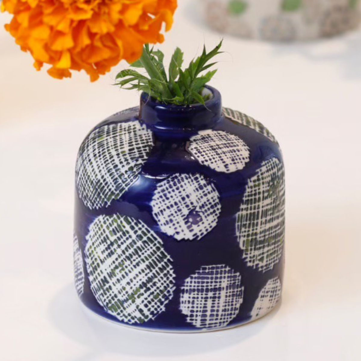 丸くてぽってりとした形が特徴的なポーリッシュポタリー風の花瓶です。表面が立体的で温かみのあるデザインの一輪挿しは様々なインテリアに溶け込み、美しい草花をより一層引き立てます。
