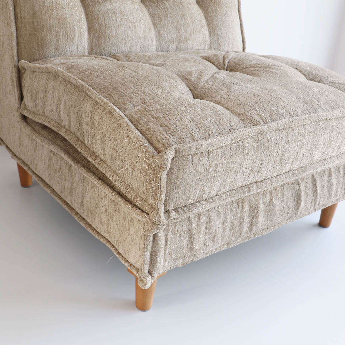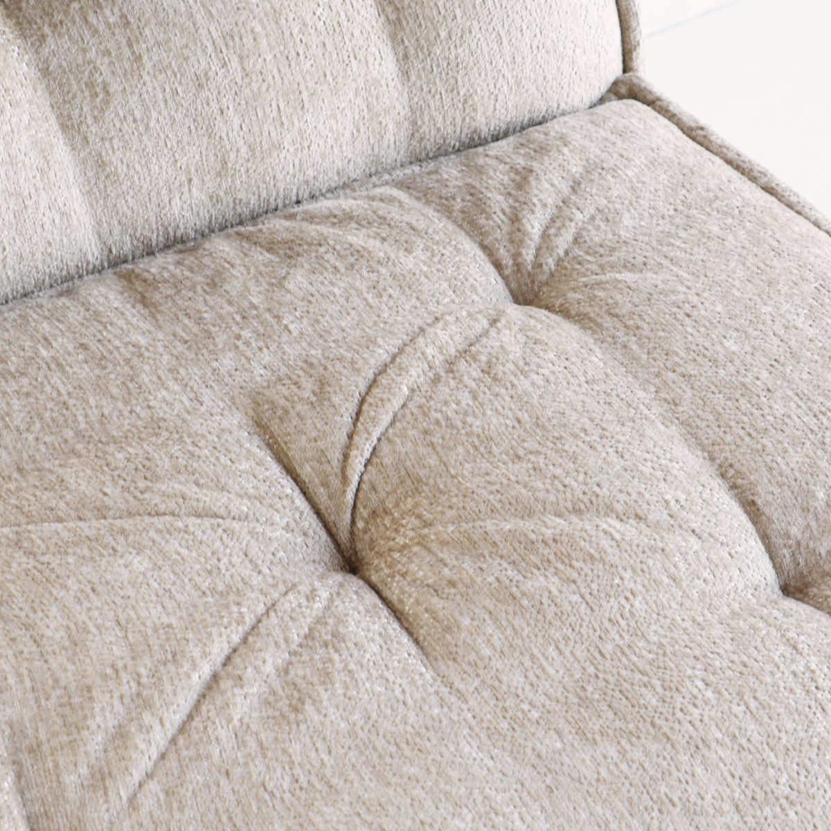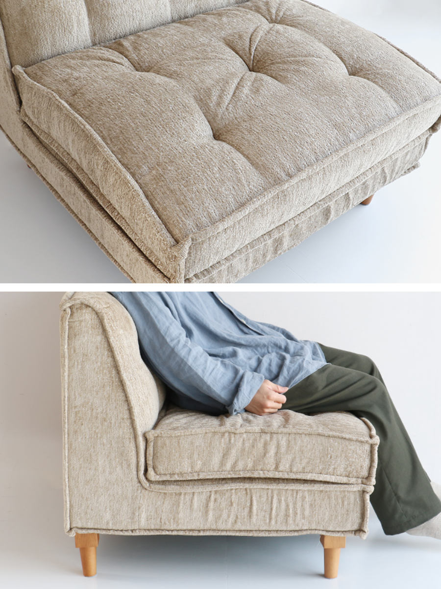 背もたれと座面のふっくらとしたクッションにボタン留め風のタフティング加工が施されているので、立体感を演出してくれます。