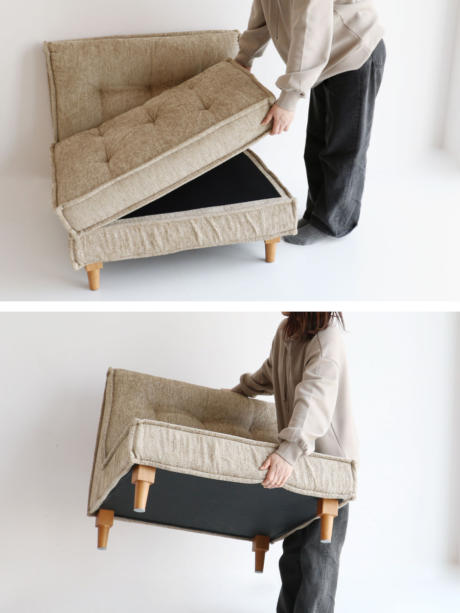 脚は取り外せるので、ロースタイルとしてもご利用いただけます。座面が低く天井が高く感じられるので、お部屋を広く見せることができます。ローテーブルなどと相性も抜群で、ゆったりとくつろげるフロアライフをお過ごしいただけます。