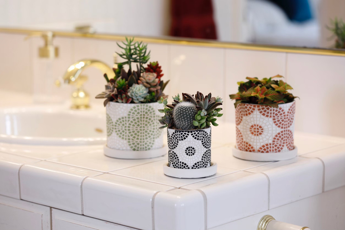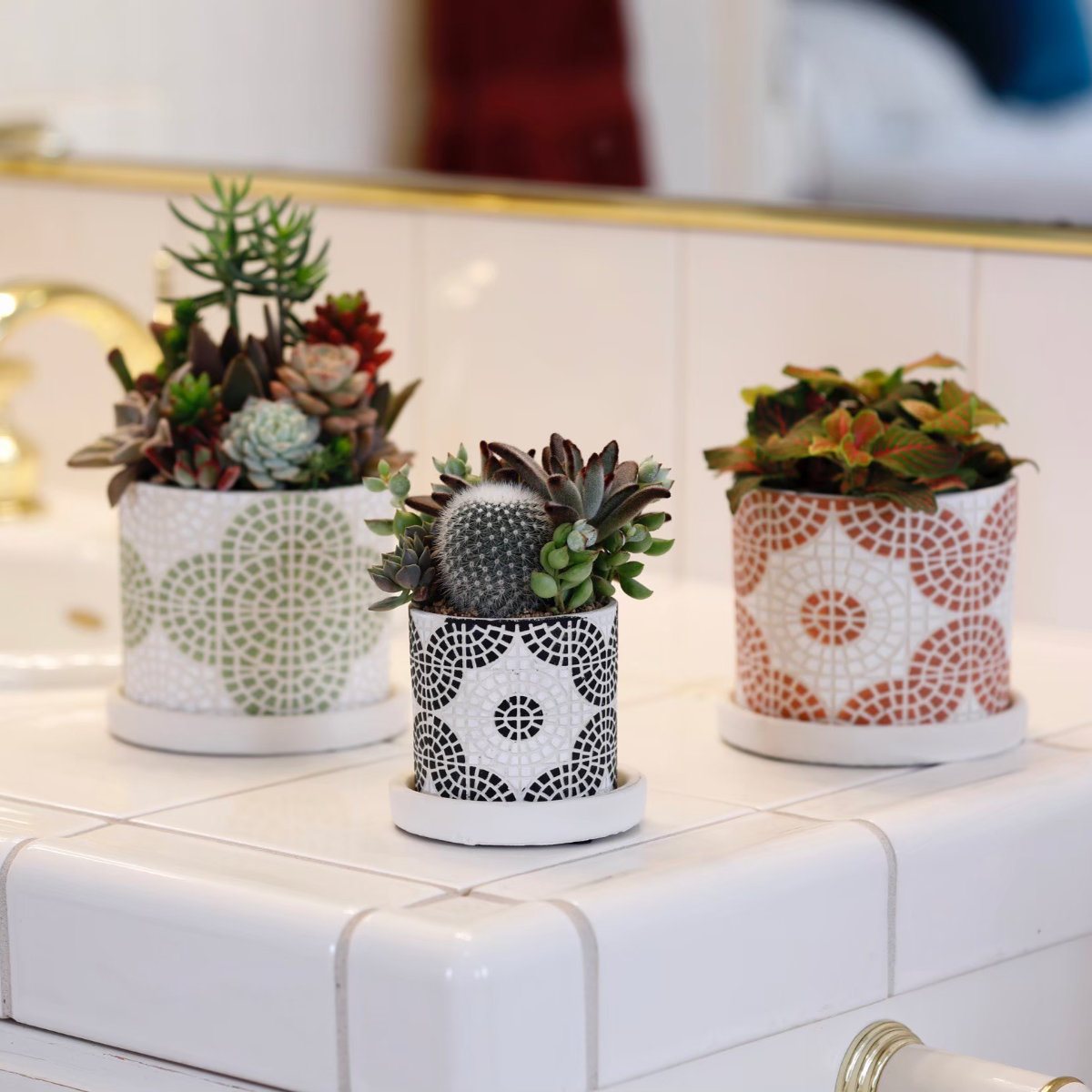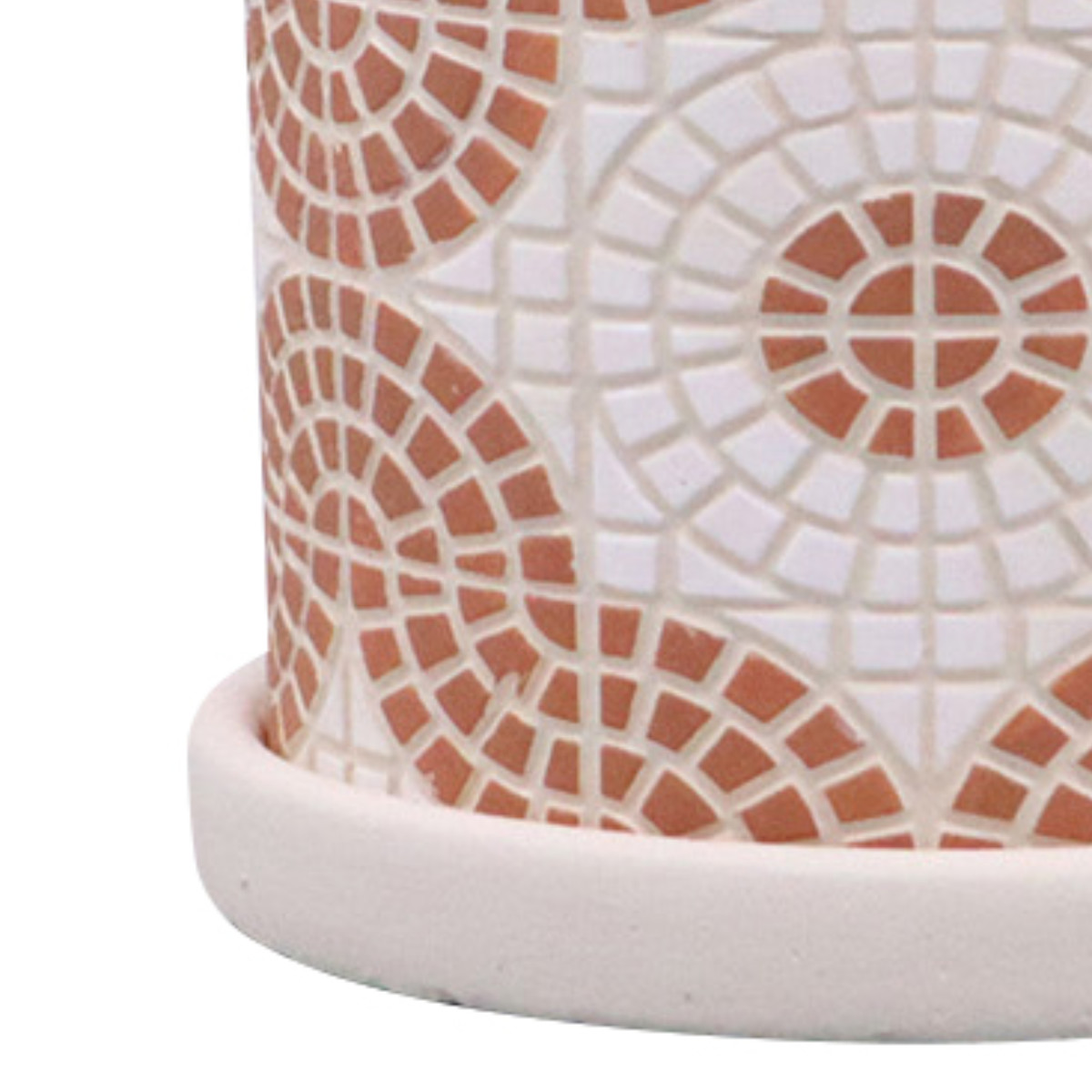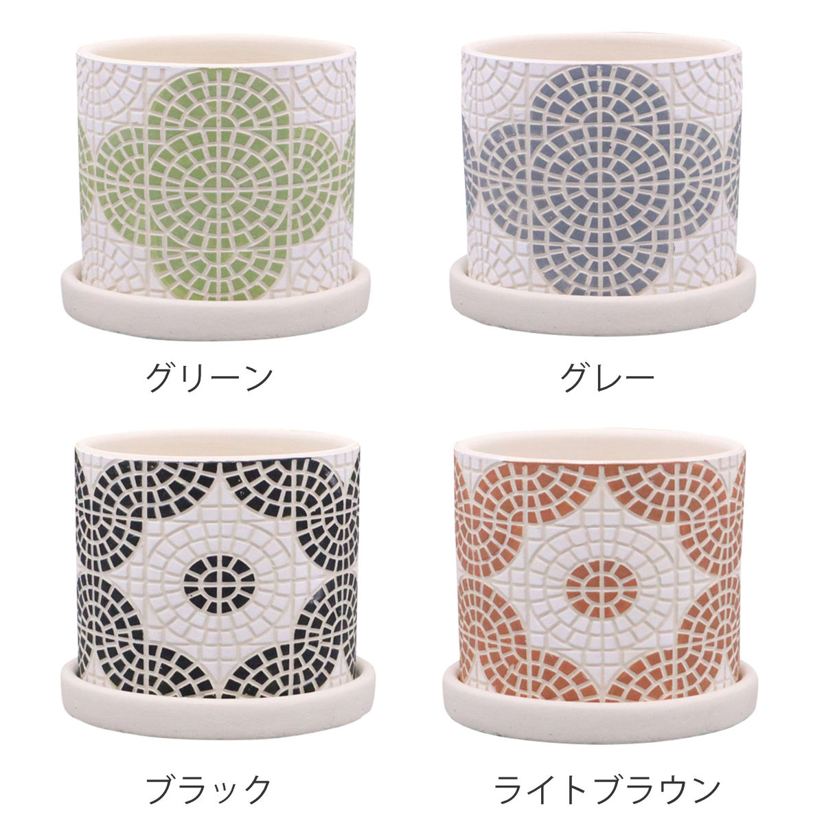 様々なタイル風デザインの鉢 Lサイズです。内径約9cmなので、テーブルサイズの観葉植物などを植えるのにぴったりなサイズ感です。ソーサー付きなので、水がこぼれる心配もなくそのまま置くことができます。
