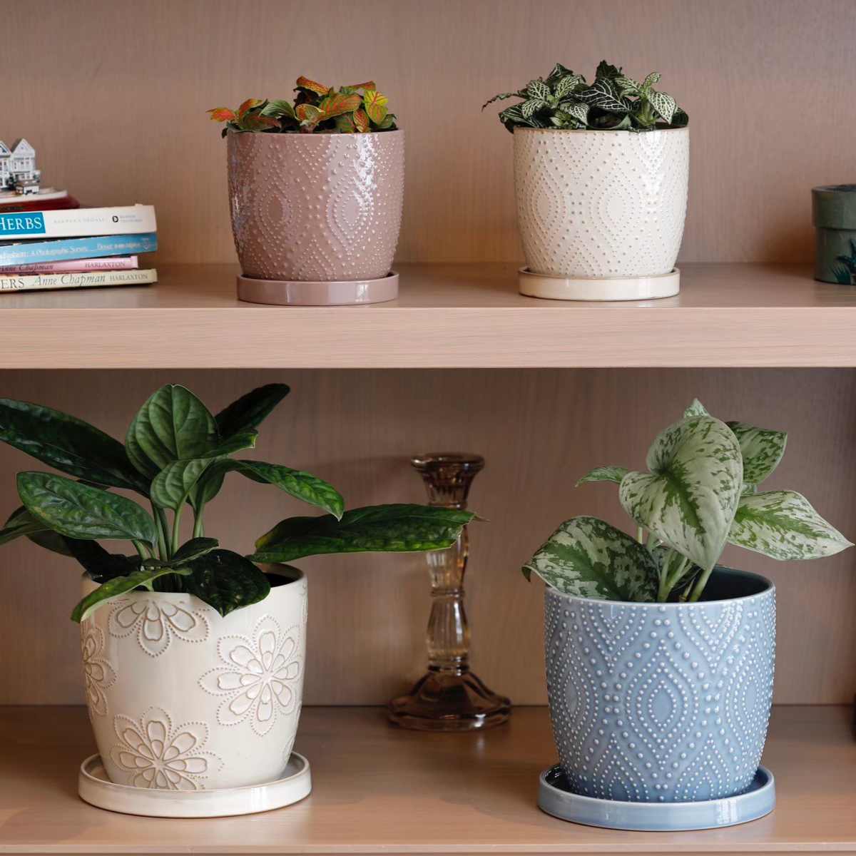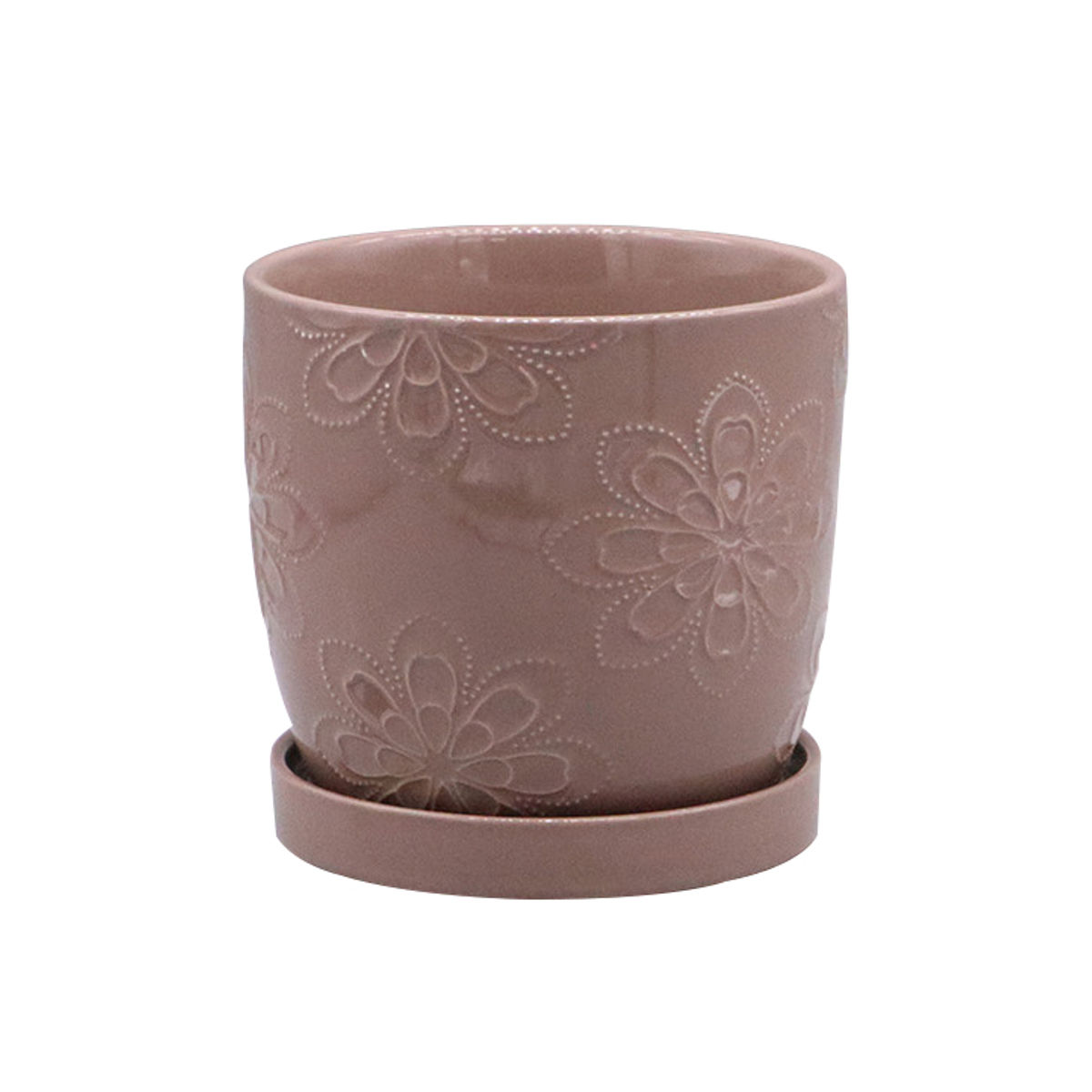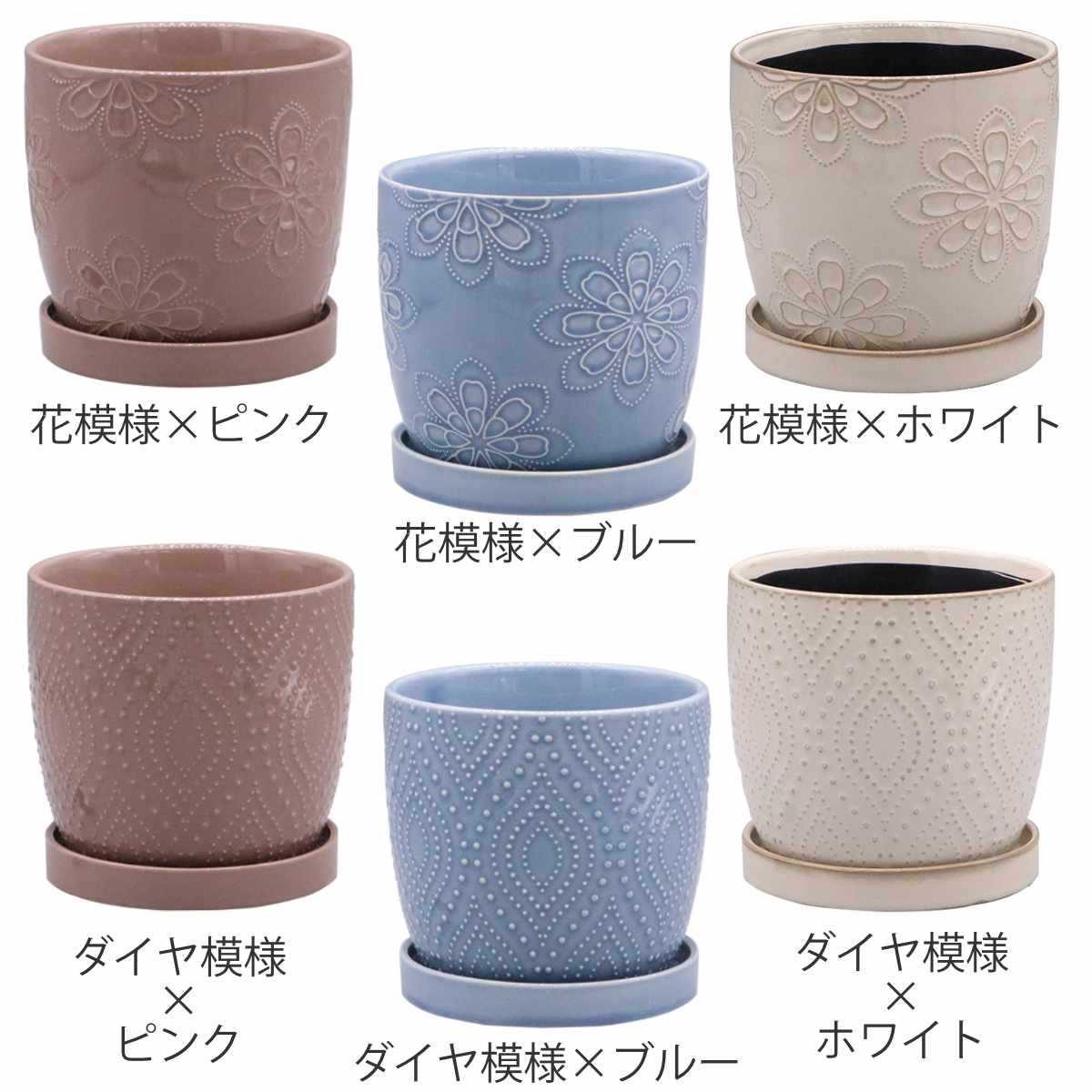 細かいパターン柄とニュアンスカラーがきれいなフラワーポットです。表面には光沢のある釉薬を使用し、植物をより活き活きと引き立たせます。底面には水抜き用の底穴が空いています。受け皿がついているので室内での使用にも最適です。