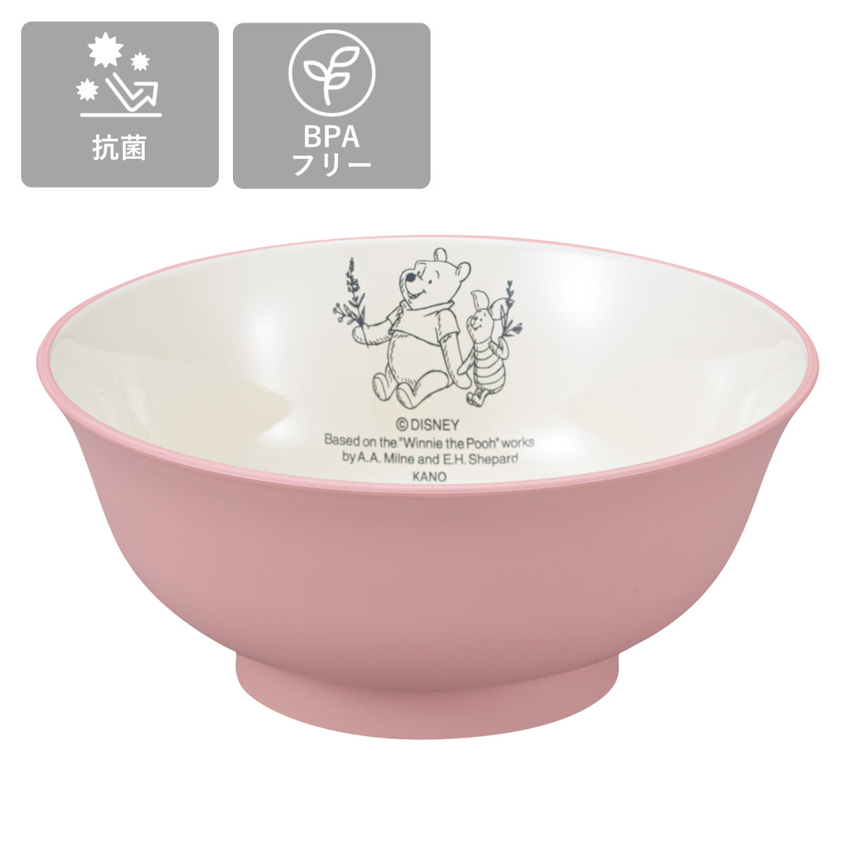 くまのプーさんとピグレットのデザインが可愛いどんぶりです。たくさん食べるようになったお子様も満足できるサイズです。丼物はもちろん、うどんやラーメンにもぴったりです。万が一落ちてしまっても割れにくいので、お子様やご年配の方にも扱いやすい器です。