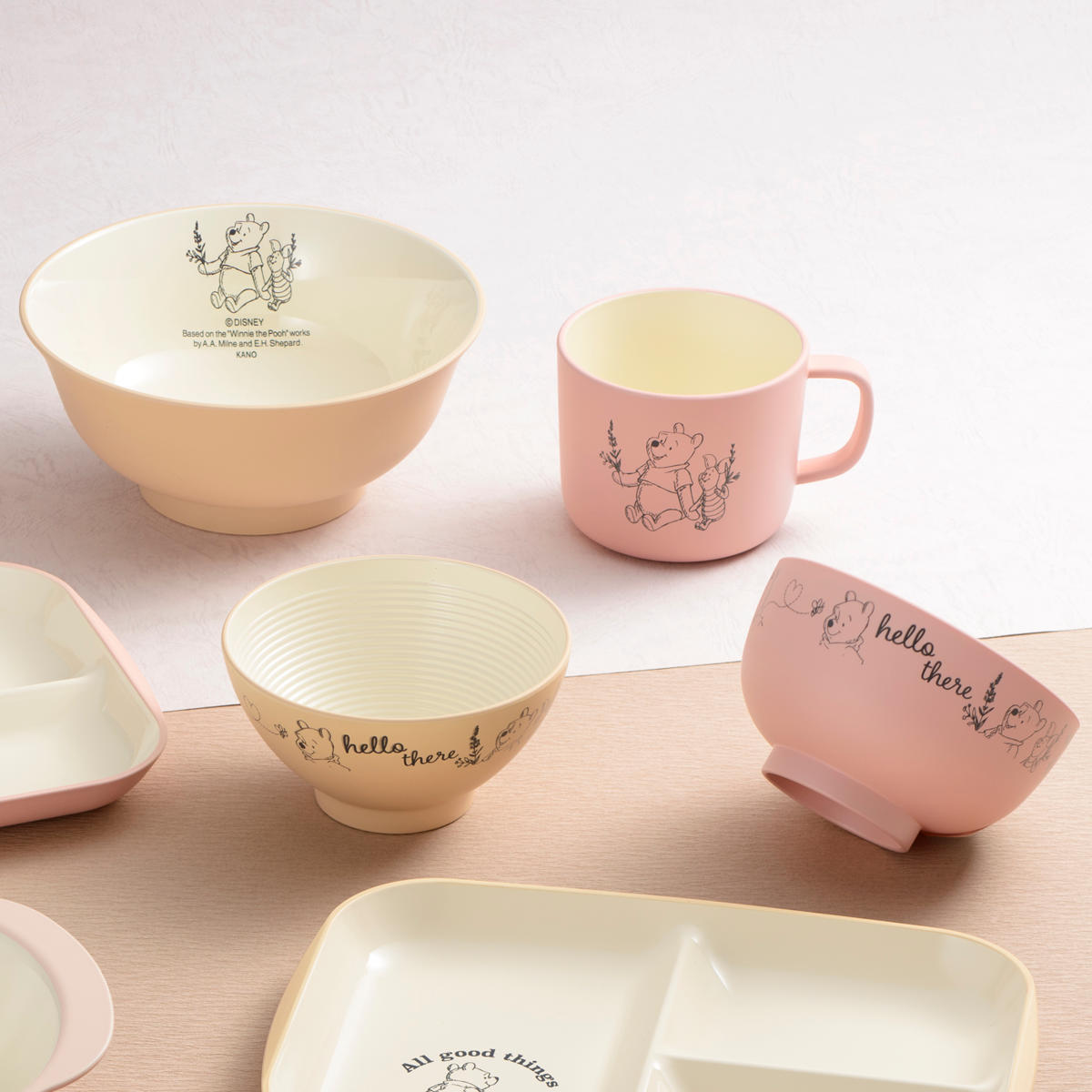 仲良しピグレットとの睦まじさを表現した愛らしいデザインです。落ち着いた色合いが優しく、食卓にもおしゃれに馴染みます。