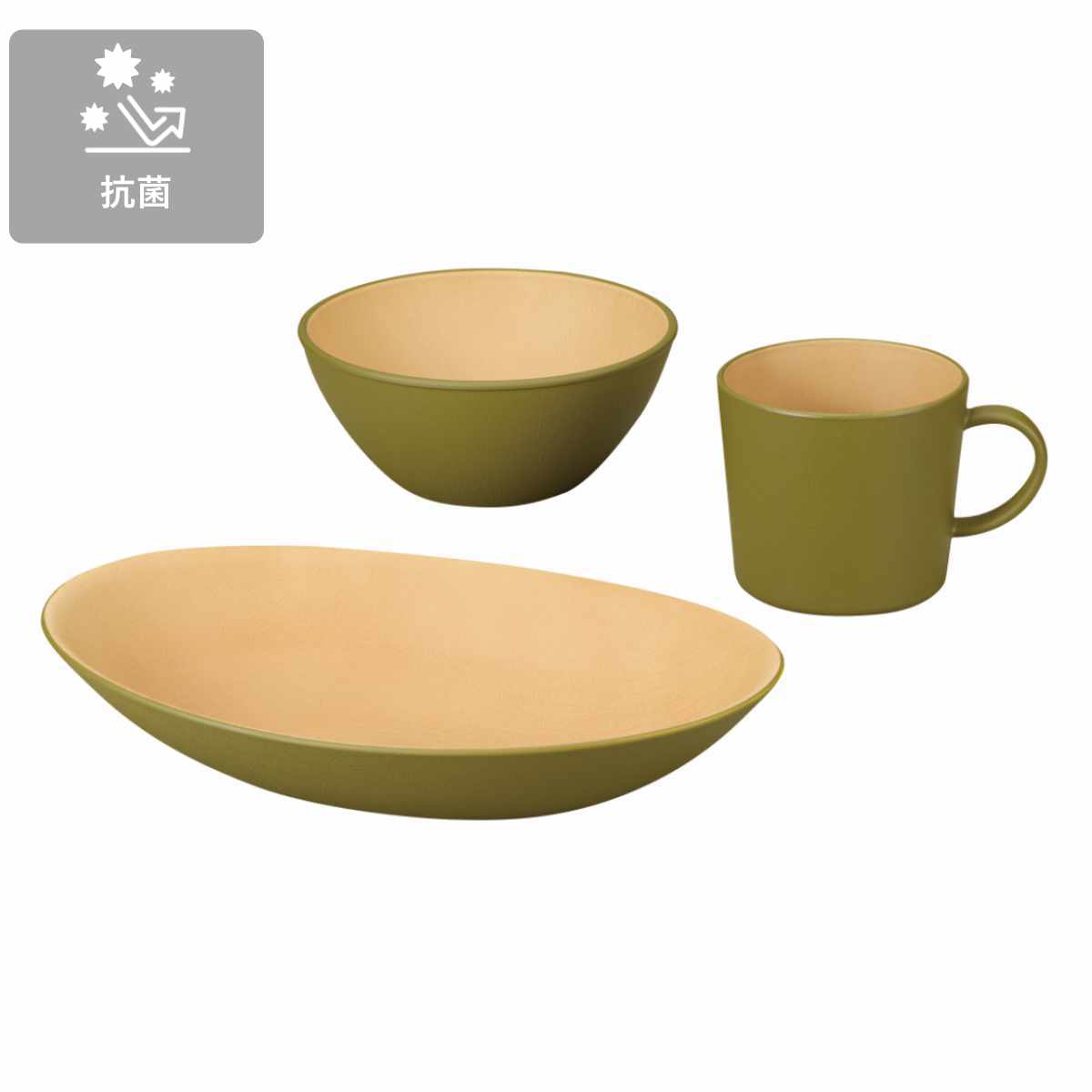 シンプルで、すっと日常に溶け込むデザインのカレーパスタ皿とボウル、マグのセットです。樹脂製なので軽くて割れにくく、扱いやすいです。