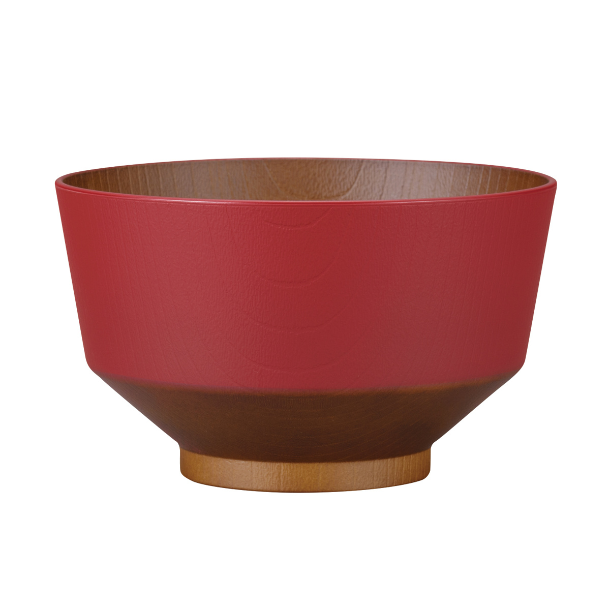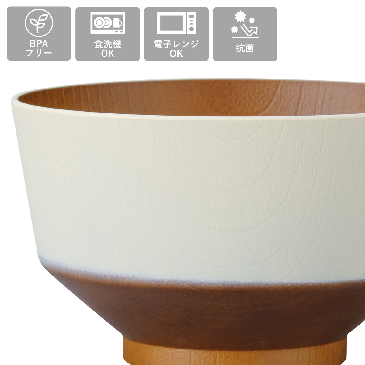 器の外側と内側には木目調のデザインが施されています。食卓に馴染みやすく、温かい雰囲気に包まれるような、ぬくもりを感じられるデザインです。
