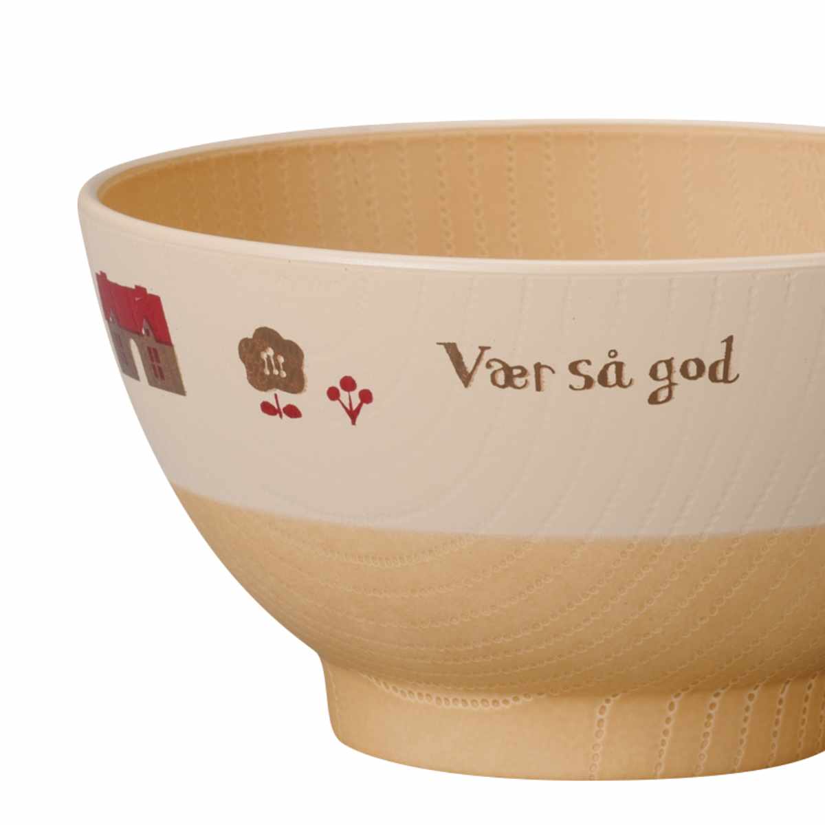 ●和でも洋でも合わせやすい木目調の子ども用飯わんです。