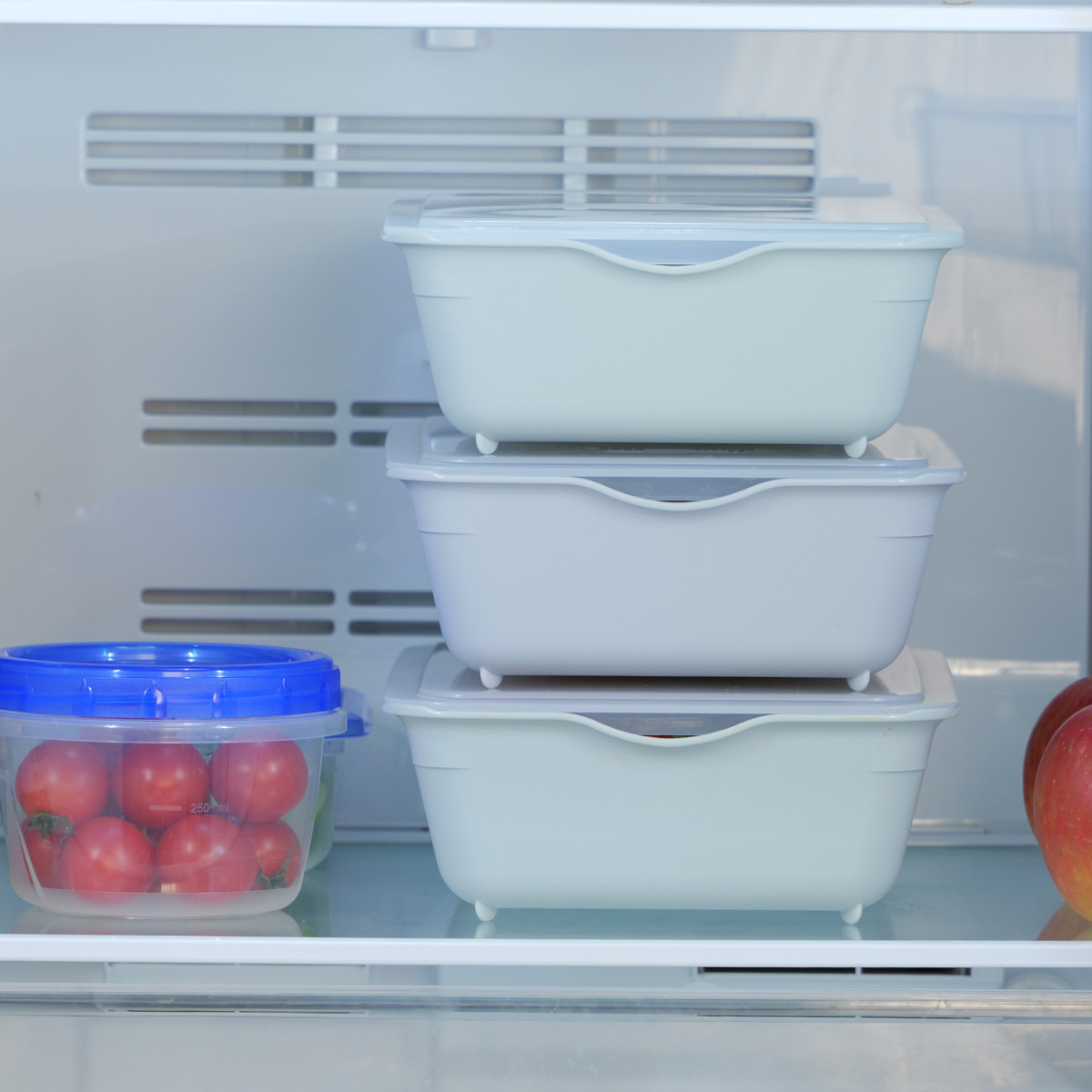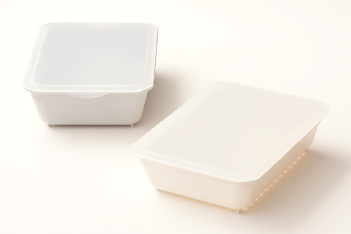 フタをすれば上に積み重ねられるので、省スペースで冷蔵庫に保存できます。フタはバットにもザルにもぴったり合います。