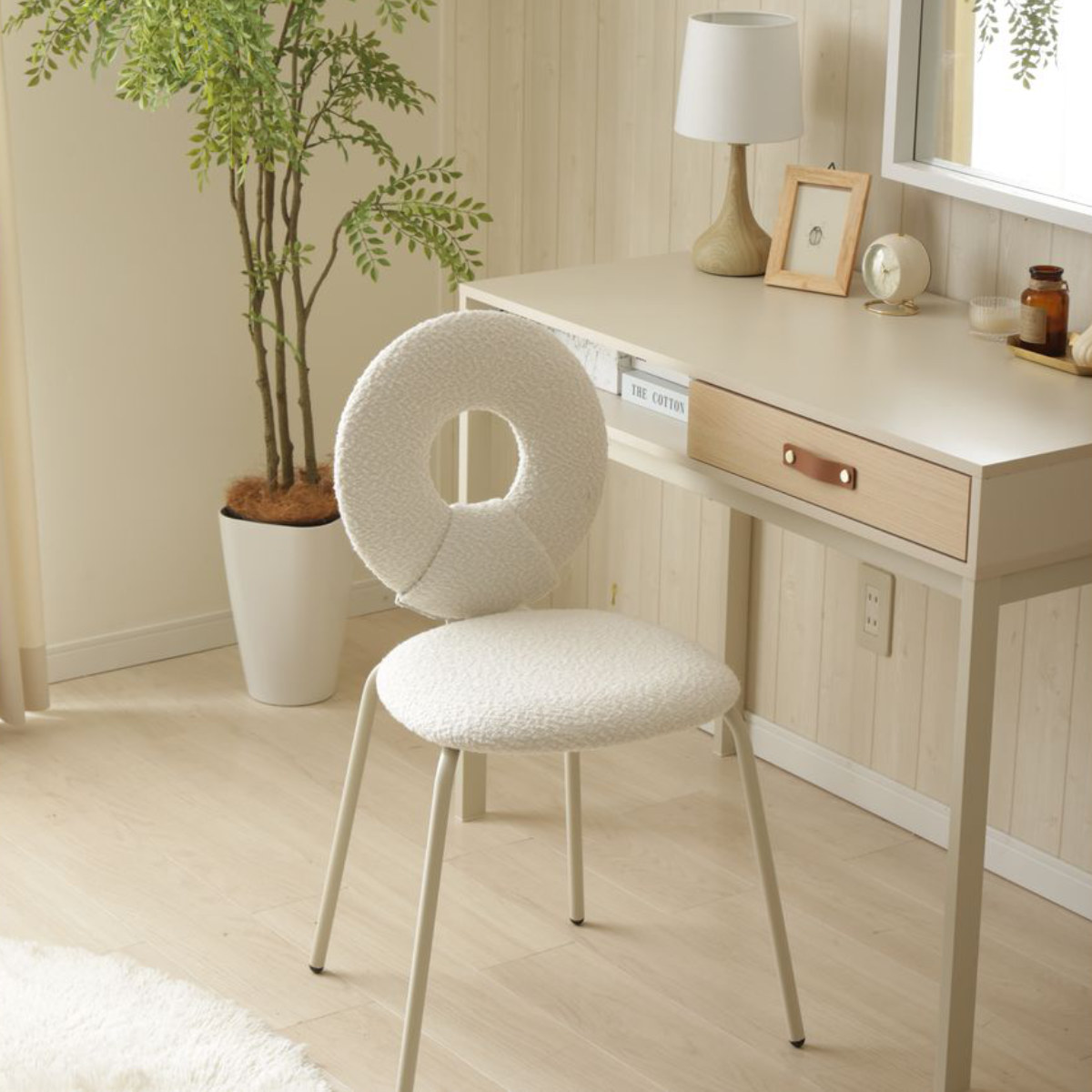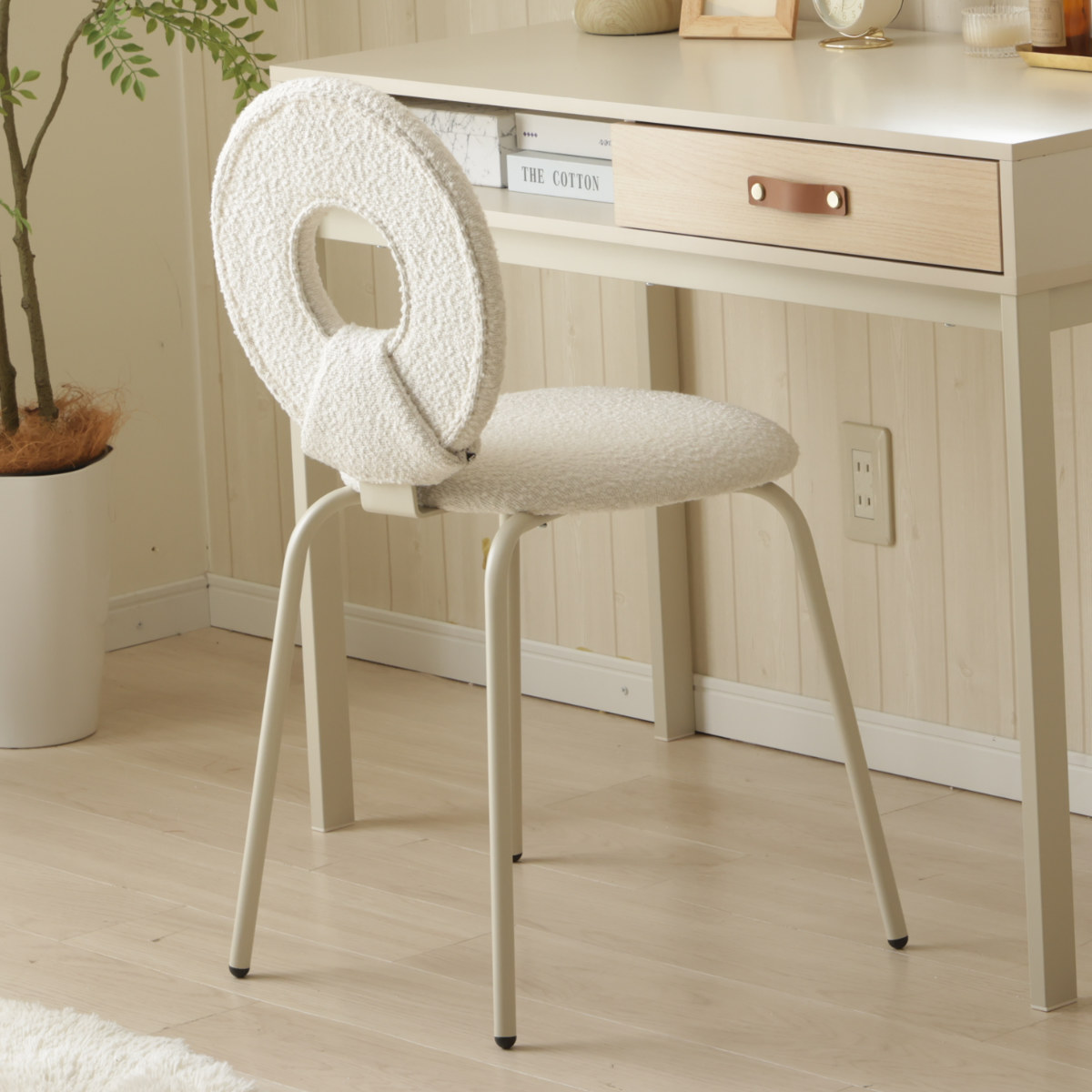 全体的に丸みを帯びた可愛らしいデザインで、お部屋に優しい雰囲気をプラスしてくれるチェアです。コンパクトなサイズ感で、デスクチェアとしてもダイニングチェアとしてもおすすめです。