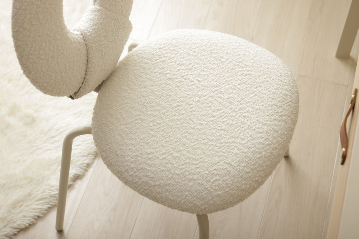 背もたれと座面の張地には、表面に糸の輪っかがでるように加工されたブークレ生地を使用しています。ふんわりもこもことした心地良い質感と柔らかな肌触りで、寒い冬も暖かく快適です。