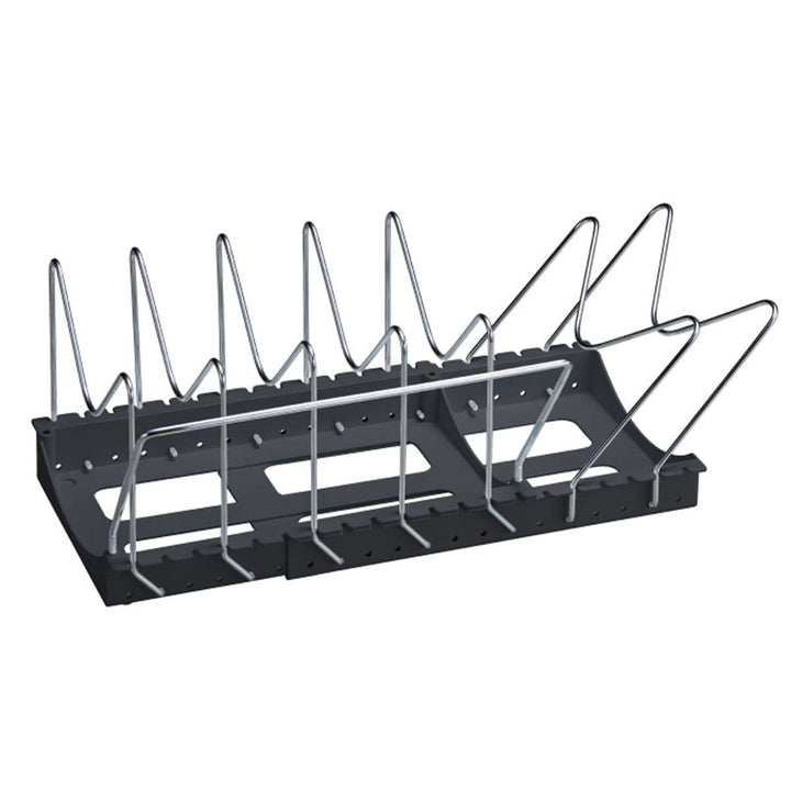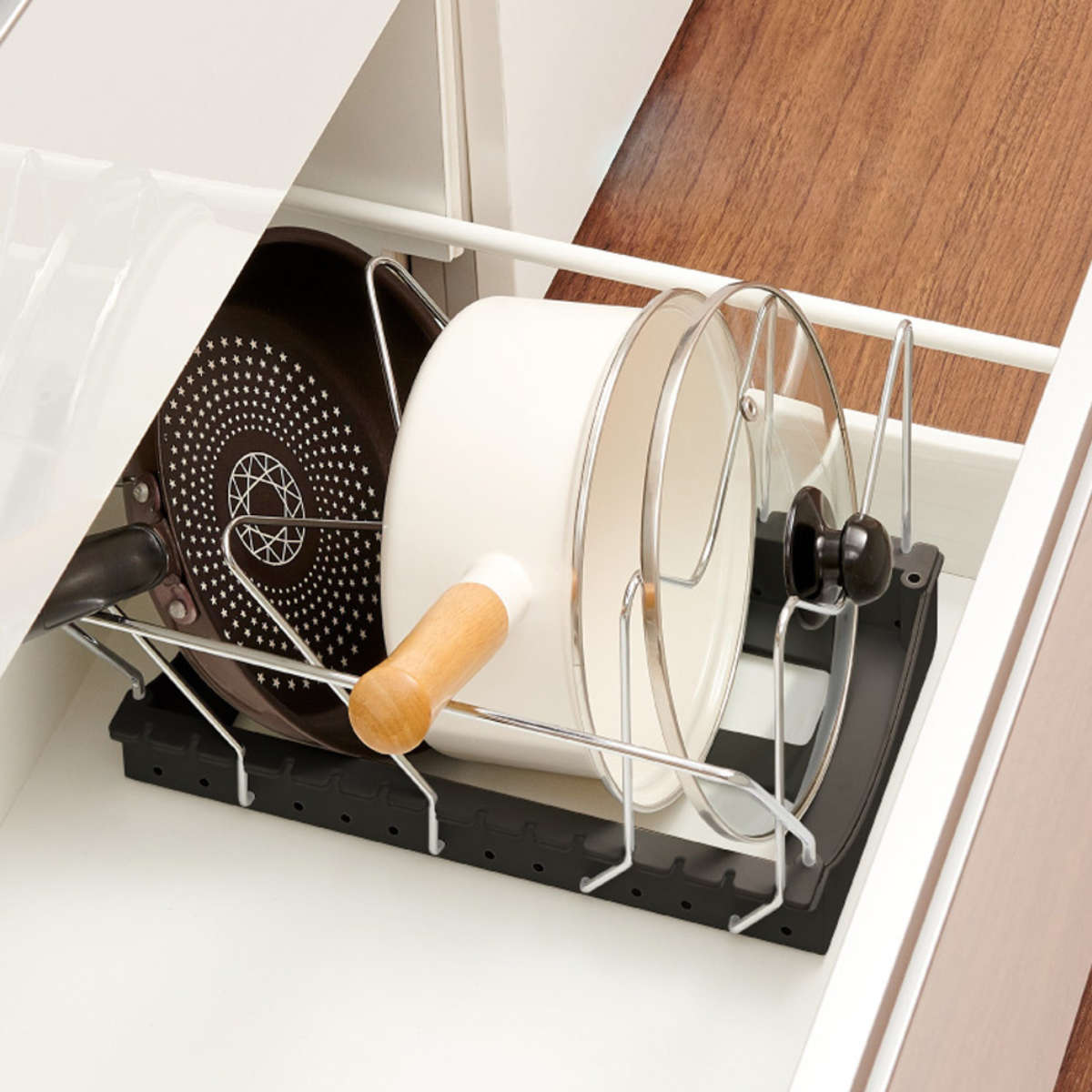 収納する物の幅に合わせて2cm間隔で調整でき、ワイヤー部分のへこみにフタの取っ手を掛けて収納することもできます。