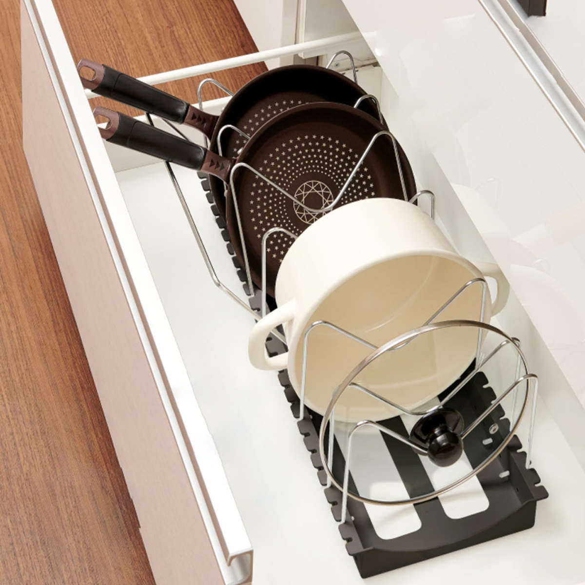 フライパンを立てて収納することで、散らかりがちだった引き出しの中がスッキリ整理され、より使いやすく生まれ変わります。