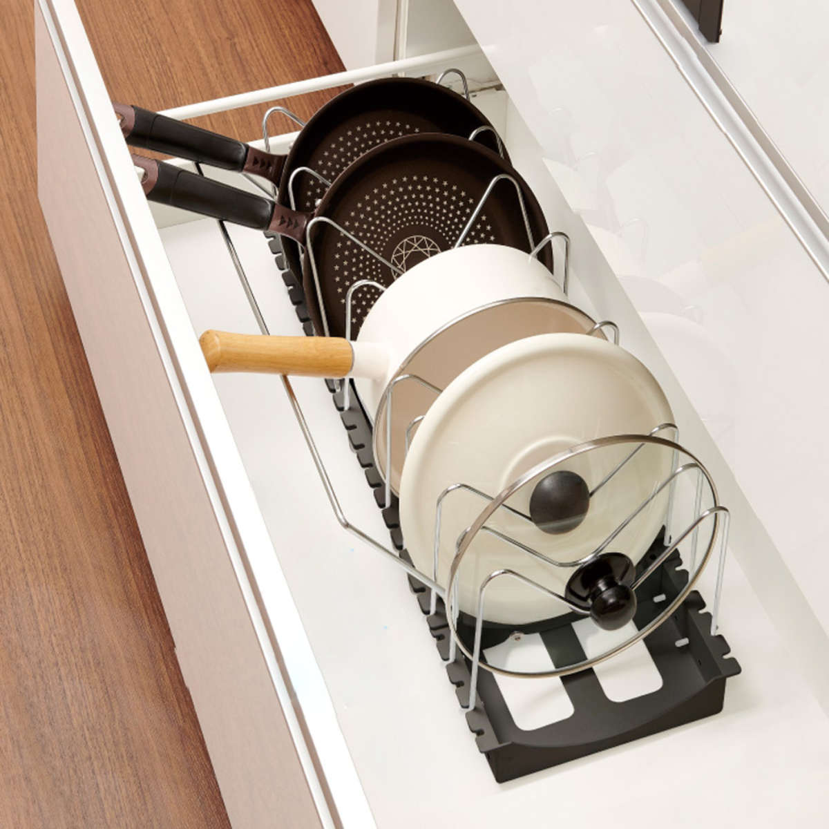 収納する物の幅に合わせて2cm間隔で調整でき、ワイヤー部分のへこみにフタの取っ手を掛けて収納することもできます。