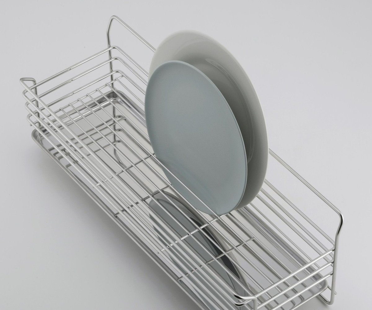 スリムな奥行で場所を取らない水切りラックです。金物のまち燕三条で作られた高品質で、安心の日本製です。シンクサイドに置くと作業スペースを広く確保でき、使った調理道具や食器をサッと洗ってすぐに乾かせる、あると便利な1台です。
