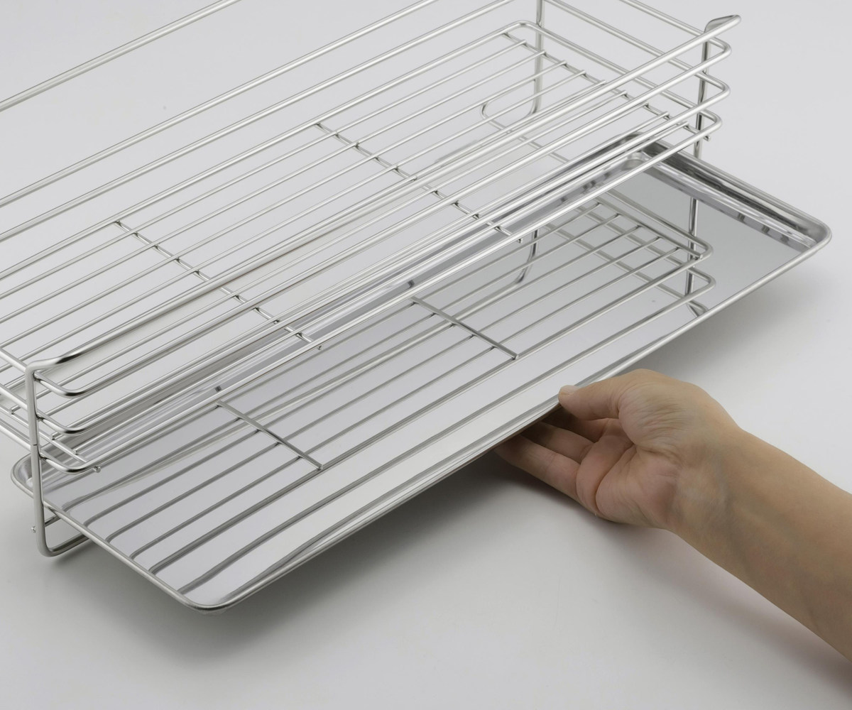 水受けトレー付きなので作業台を汚しません。トレーだけで引き出すことが可能なので、水切りが直ぐに出来て、お手入れも簡単です。
