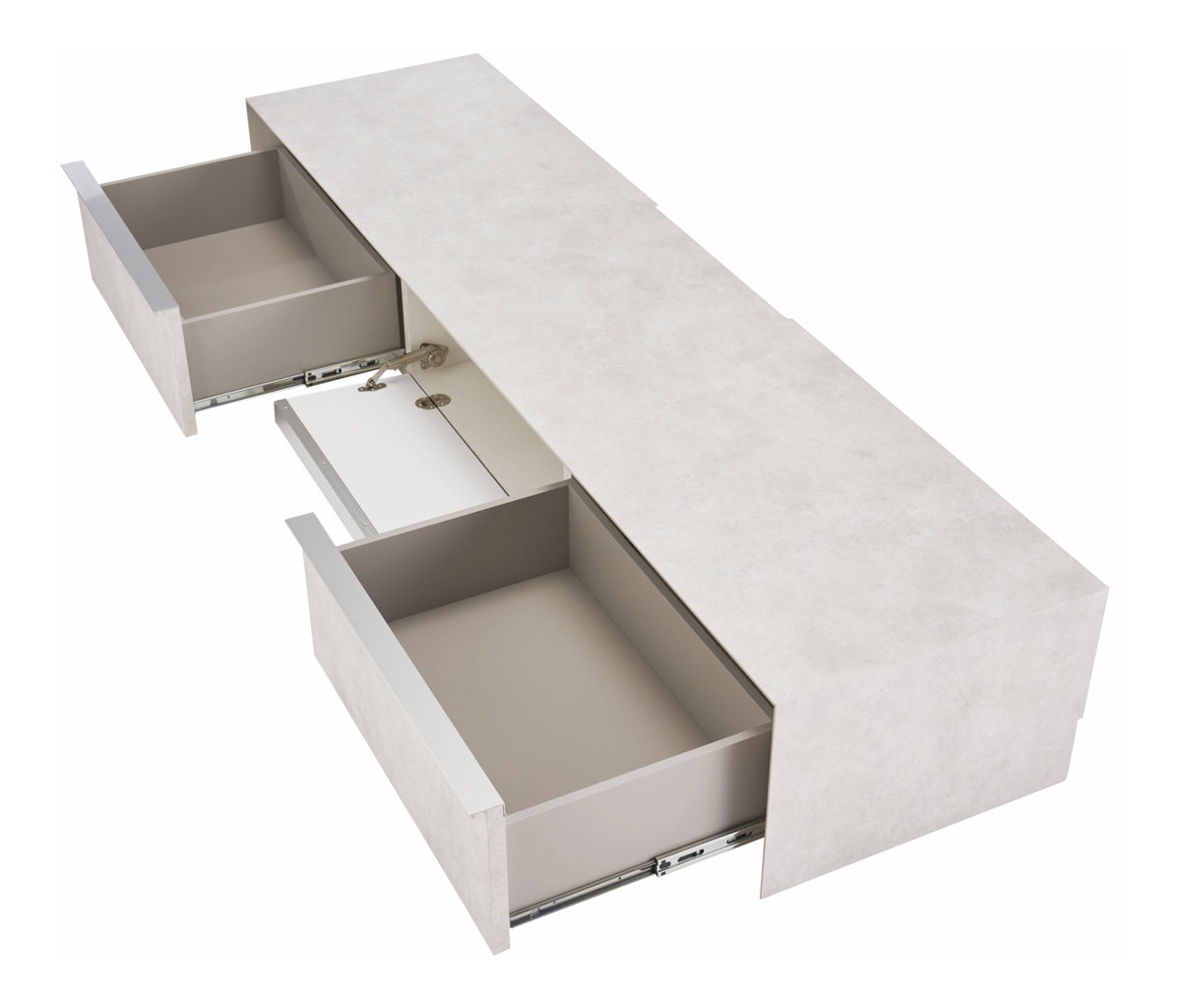 中央はフラップ式の扉収納、左右は引出し収納。圧迫感のないローボードですが、大容量の収納が可能です。フラップ式の扉収納には、背面にコードを通すことができる穴が2か所設けられているので、機器の配線の際に便利です。