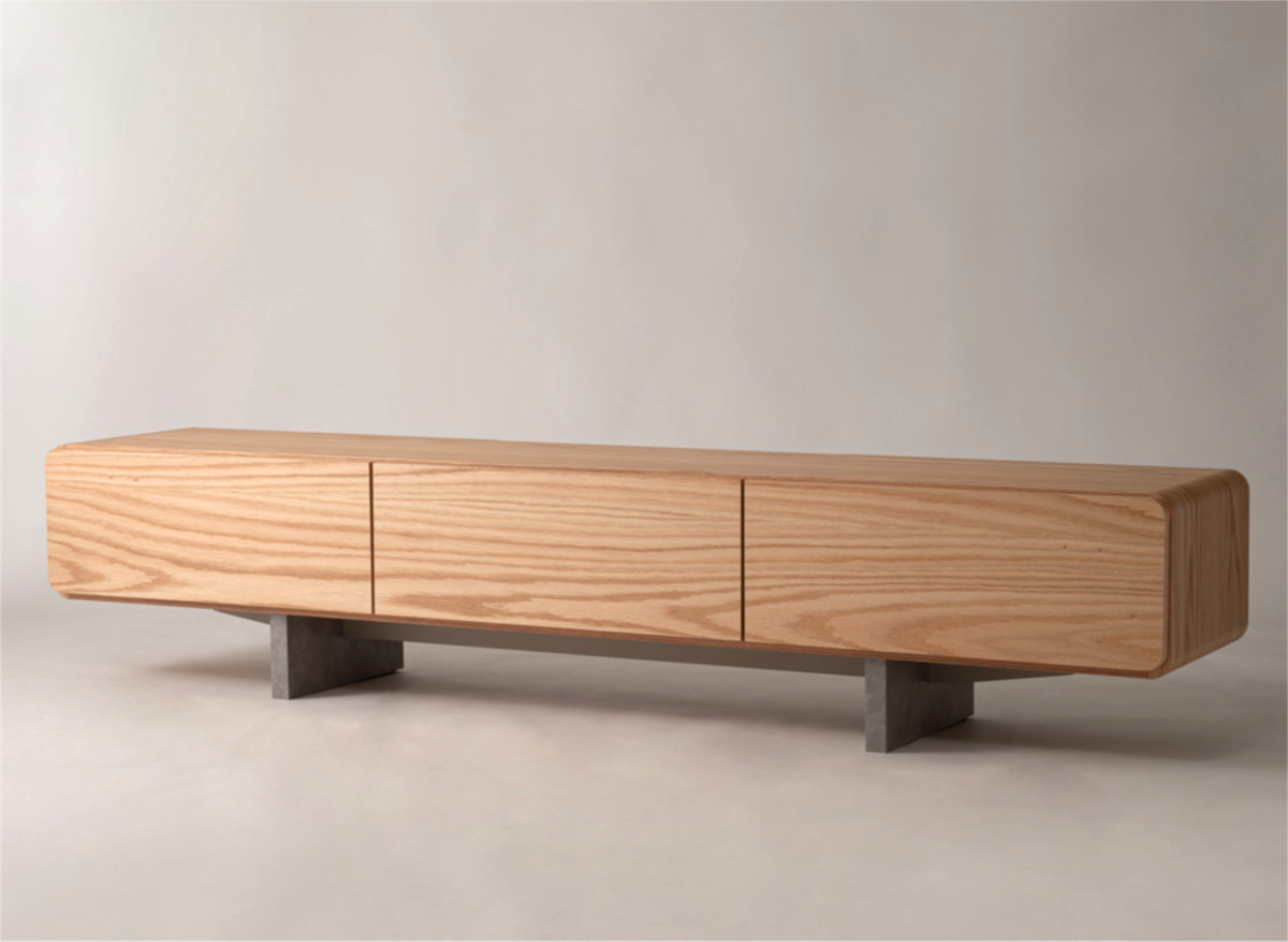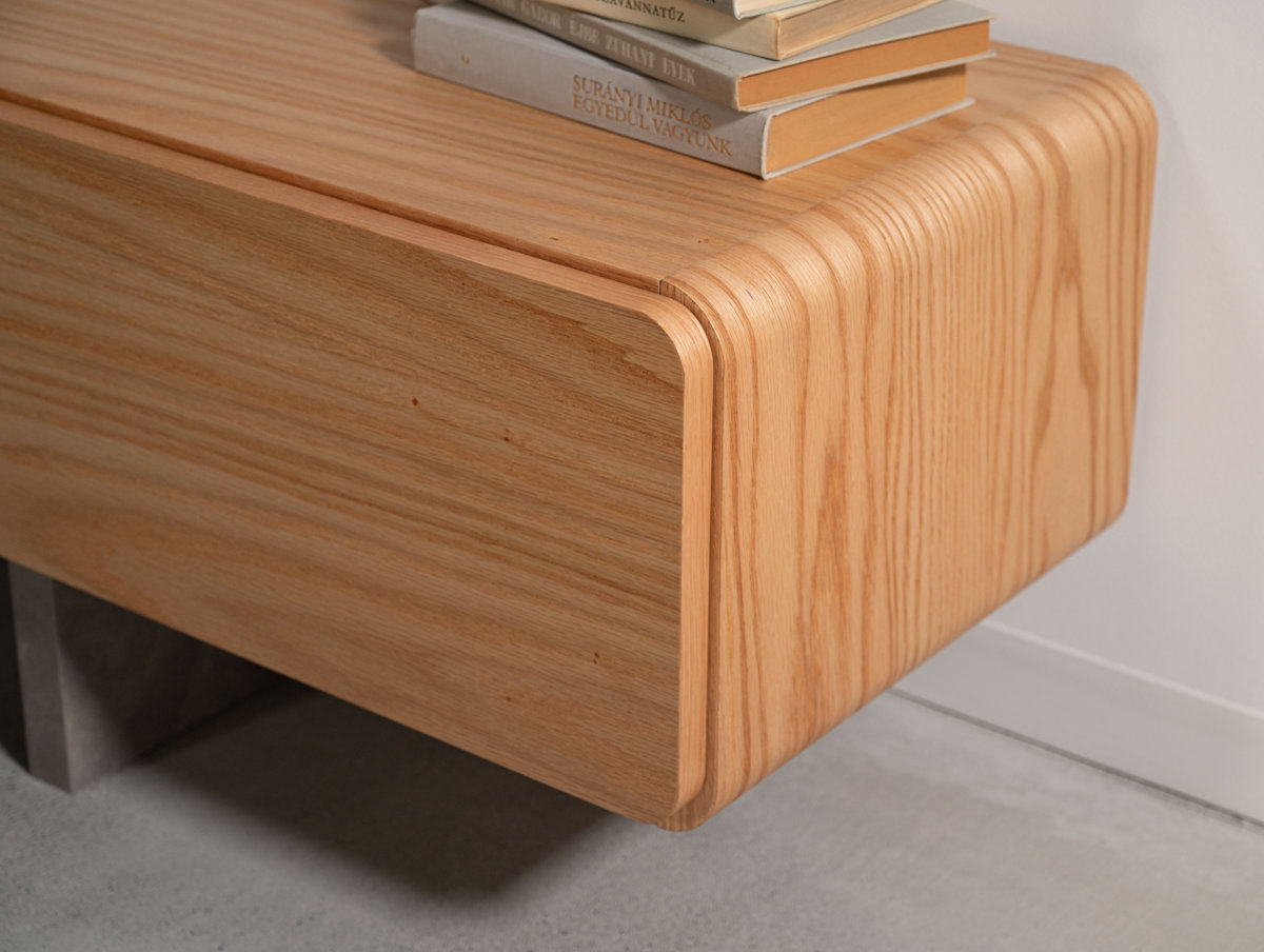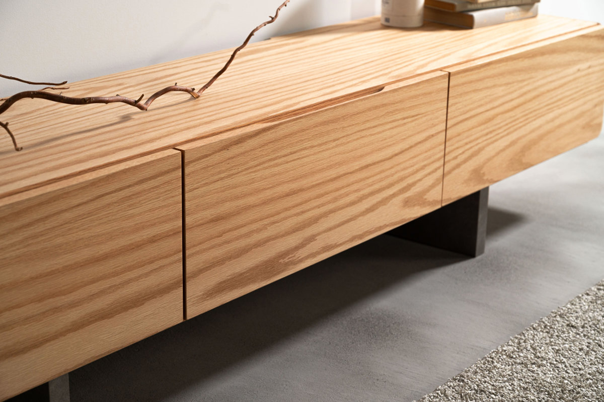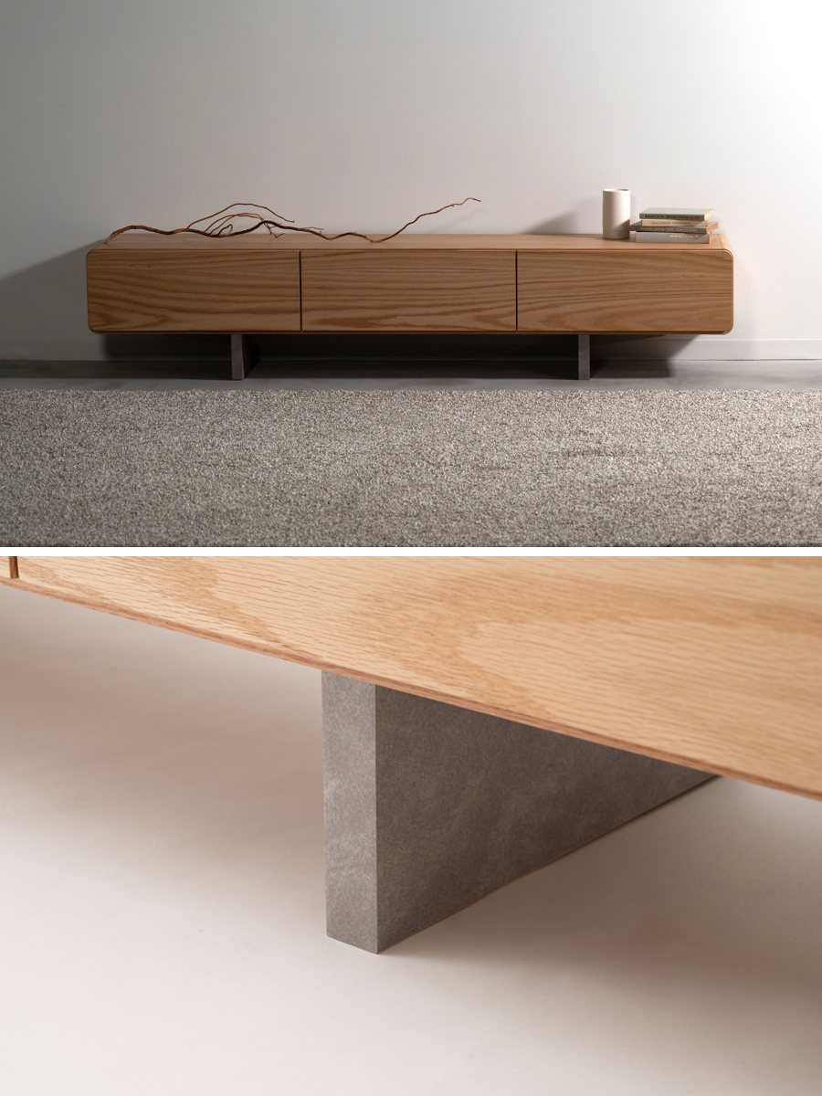 引き出しの前板は木目が繋がるようにデザインされたローボードです。丸みのある天然木の優しさと、脚部の石目調の力強さが組み合わさった、異素材の調和を感じる仕上がり。石目調×木目の美しい組み合わせで、和モダンな空間作りをお楽しみください。