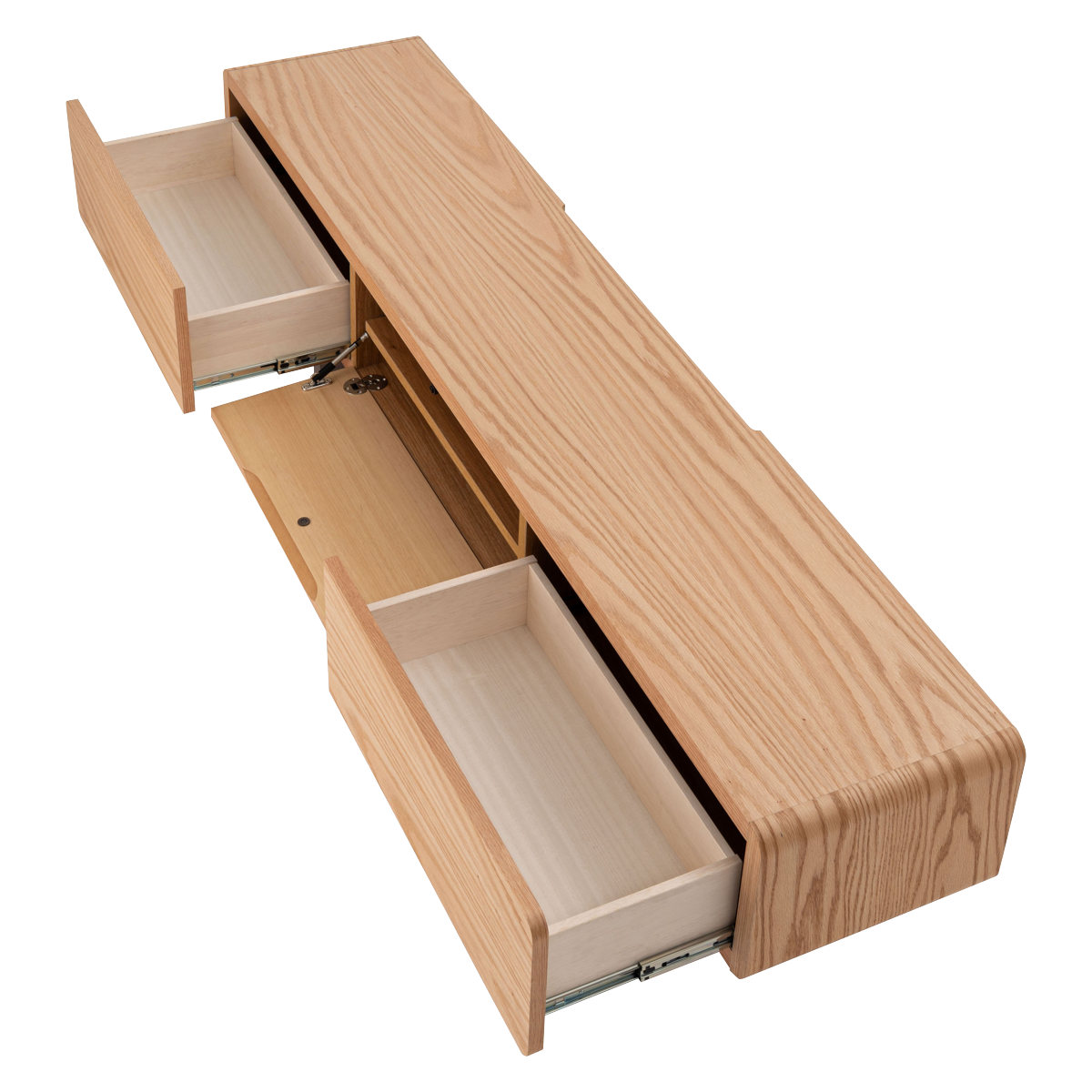 中央はフラップ式の扉収納、左右は引出し収納。圧迫感のないローボードですが、大容量の収納が可能です。フラップ式の扉収納には、背面にコードを通すことができる穴が設けられているので、機器の配線の際に便利です。
