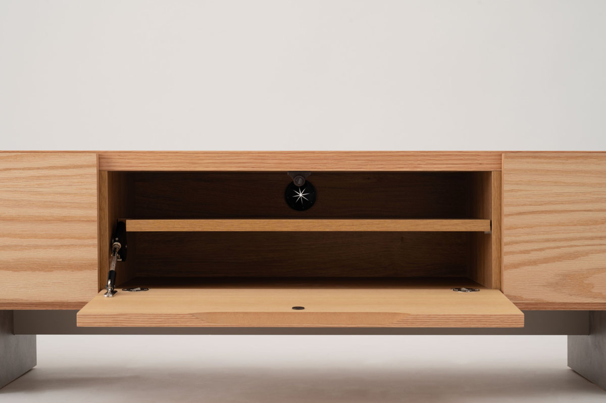 中央のフラップ扉は、上部の隙間に手を掛けて開閉する仕様です。あえて取っ手を付けず、木目を最大限に目立たせました。扉はソフトダウンダンパーを採用しているため、ゆっくりと静かに開きます。
