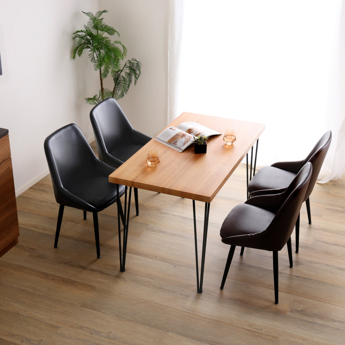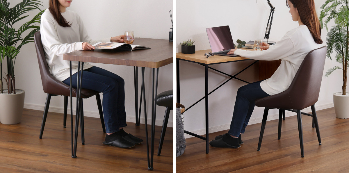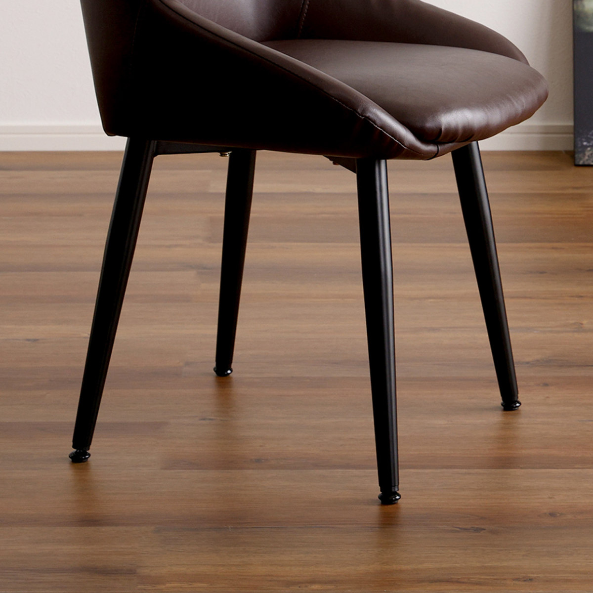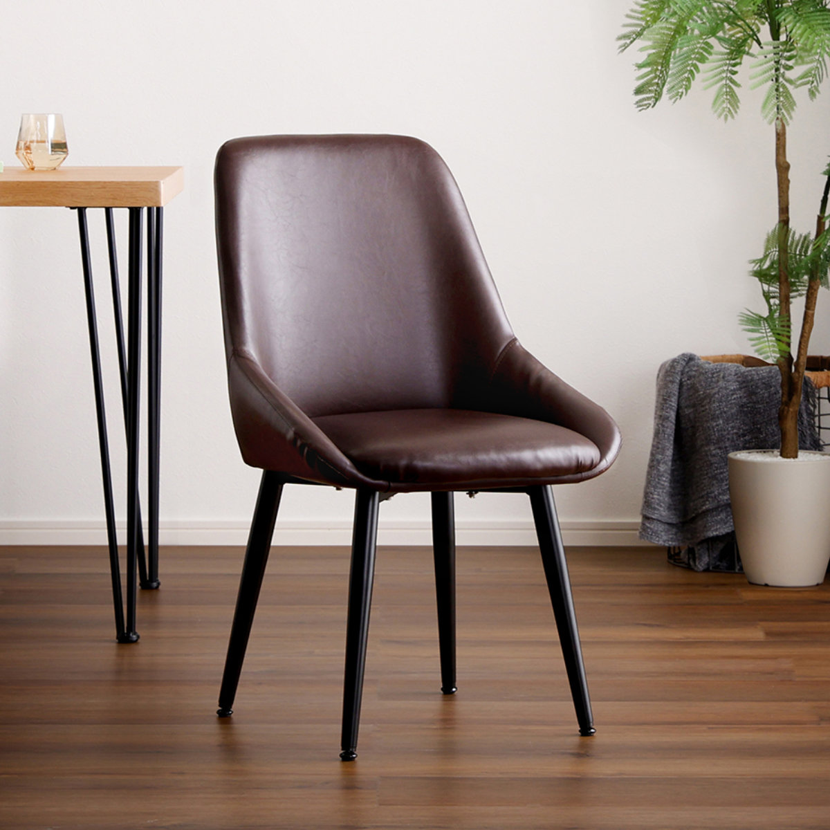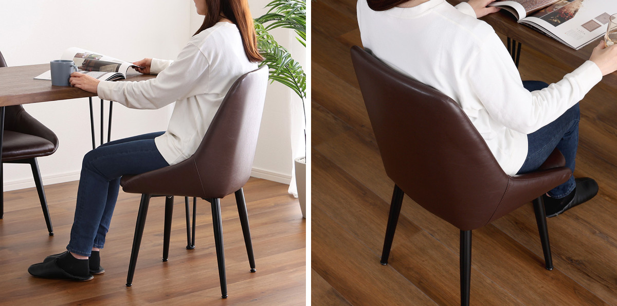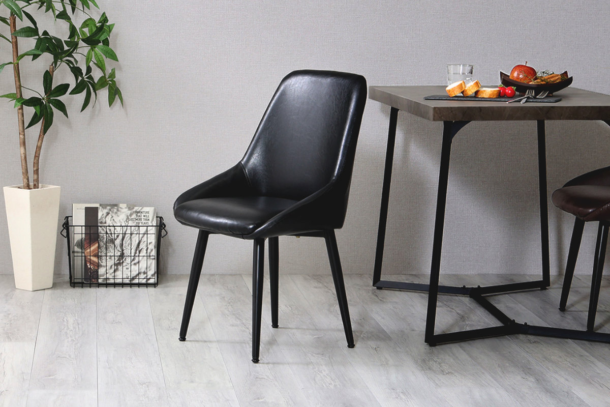 座り心地とインテリア性を兼ね備えたダイニングチェアです。まるで本革のような風合いの張地に、シャープなスチール脚の洗練されたコンビネーション。ヴィンテージ感溢れるフォルムが、落ち着いた空間を演出します。