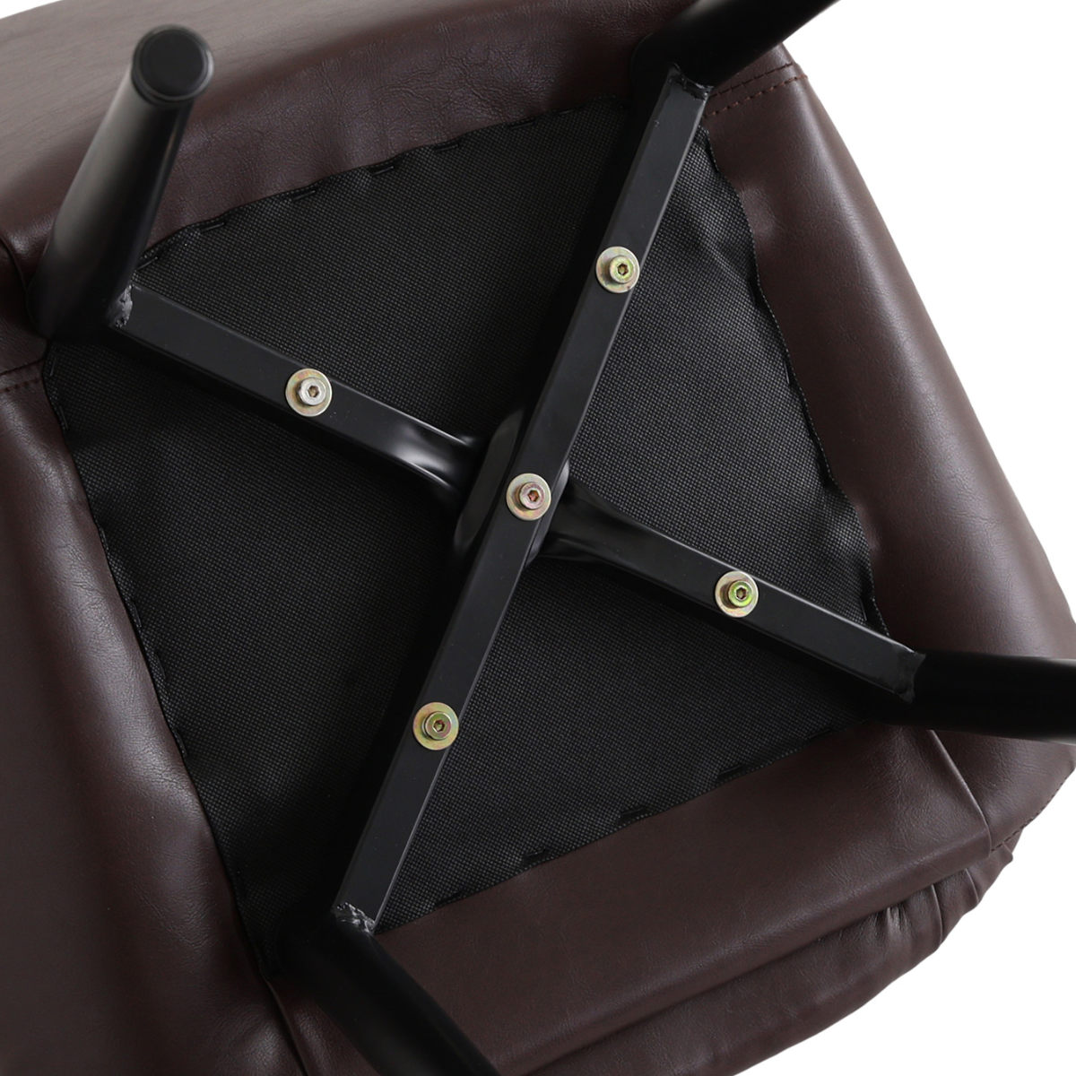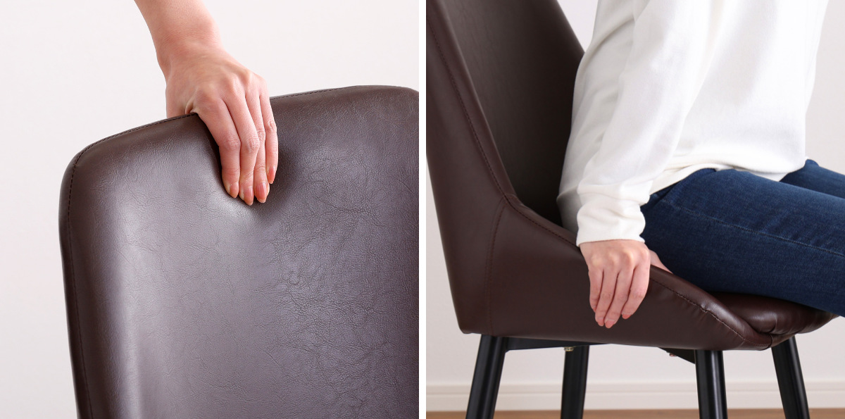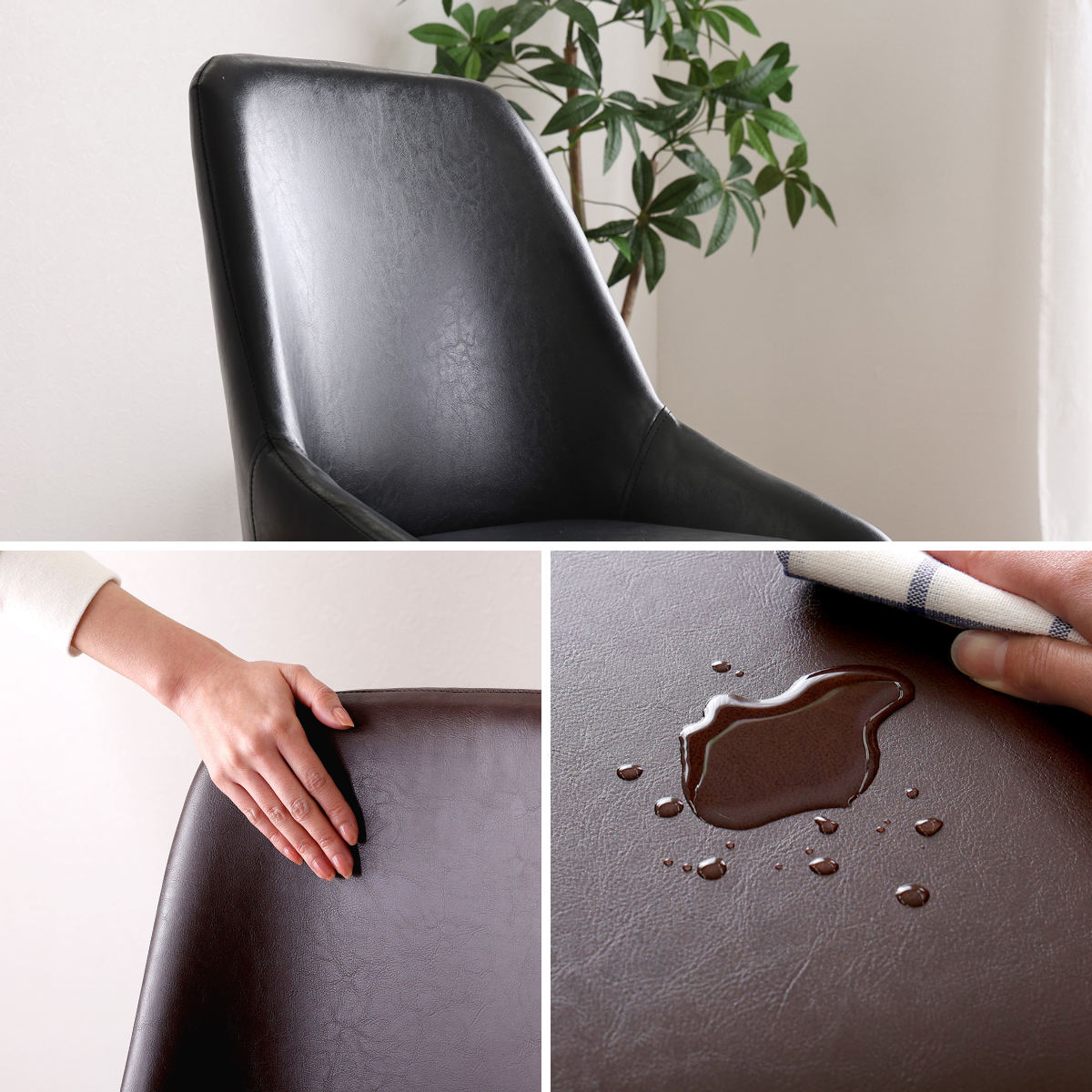 座面と背もたれはPVCレザーを使用しており、本革のようなリアルな質感です。PVC生地は水や汚れに強く、サッと拭くだけでお手入れも簡単です。
