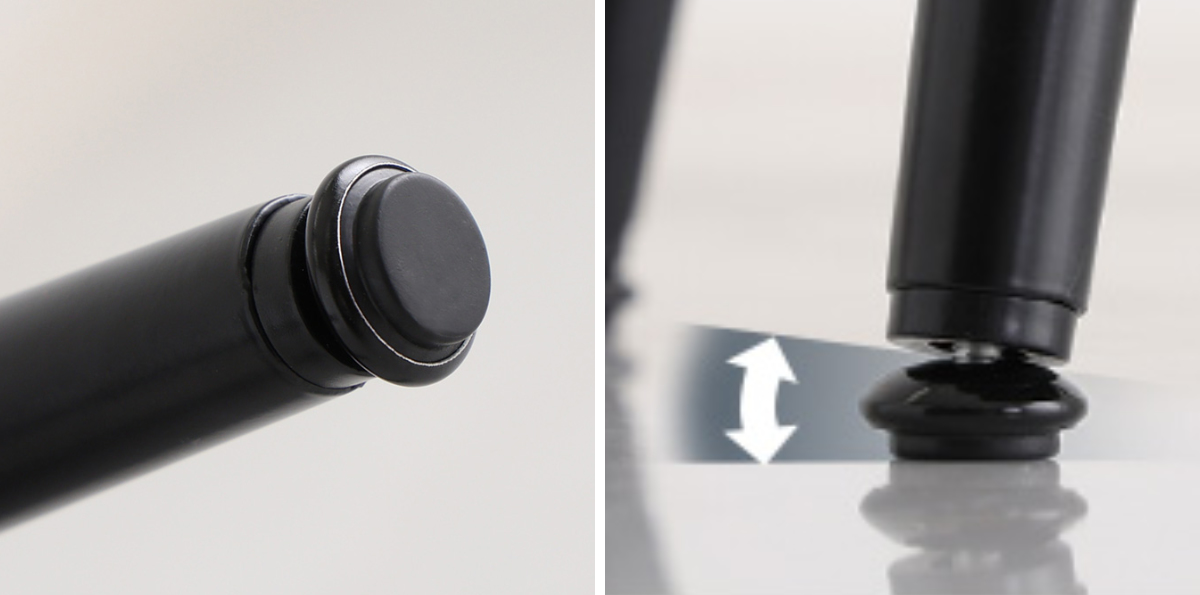 アジャスターは傾斜面設置タイプなので、床との設置面に傾斜があっても水平を保つことができ、脚のガタつきを抑えます。