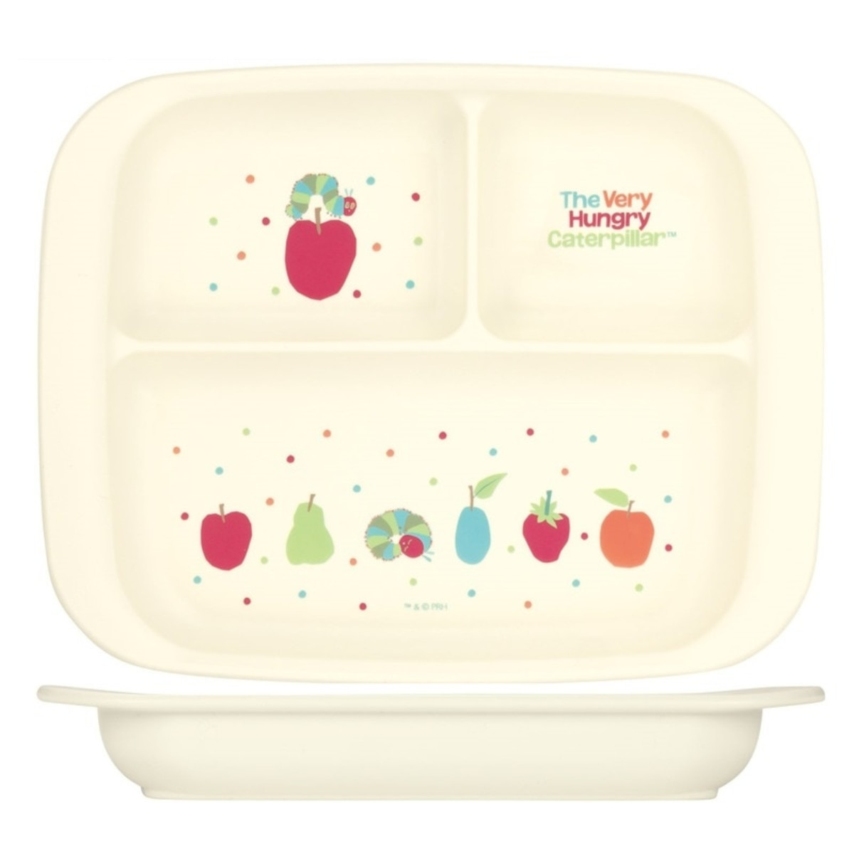 3つの仕切りで盛り付けしやすく、食べ物がはみ出しにくい高い仕切りです。手前がほぼ直角の立ち上がりで食べ物がすくいやすい形状で、奥はなだらかで集めやすくなっています。持ちやすいフチ付きです。