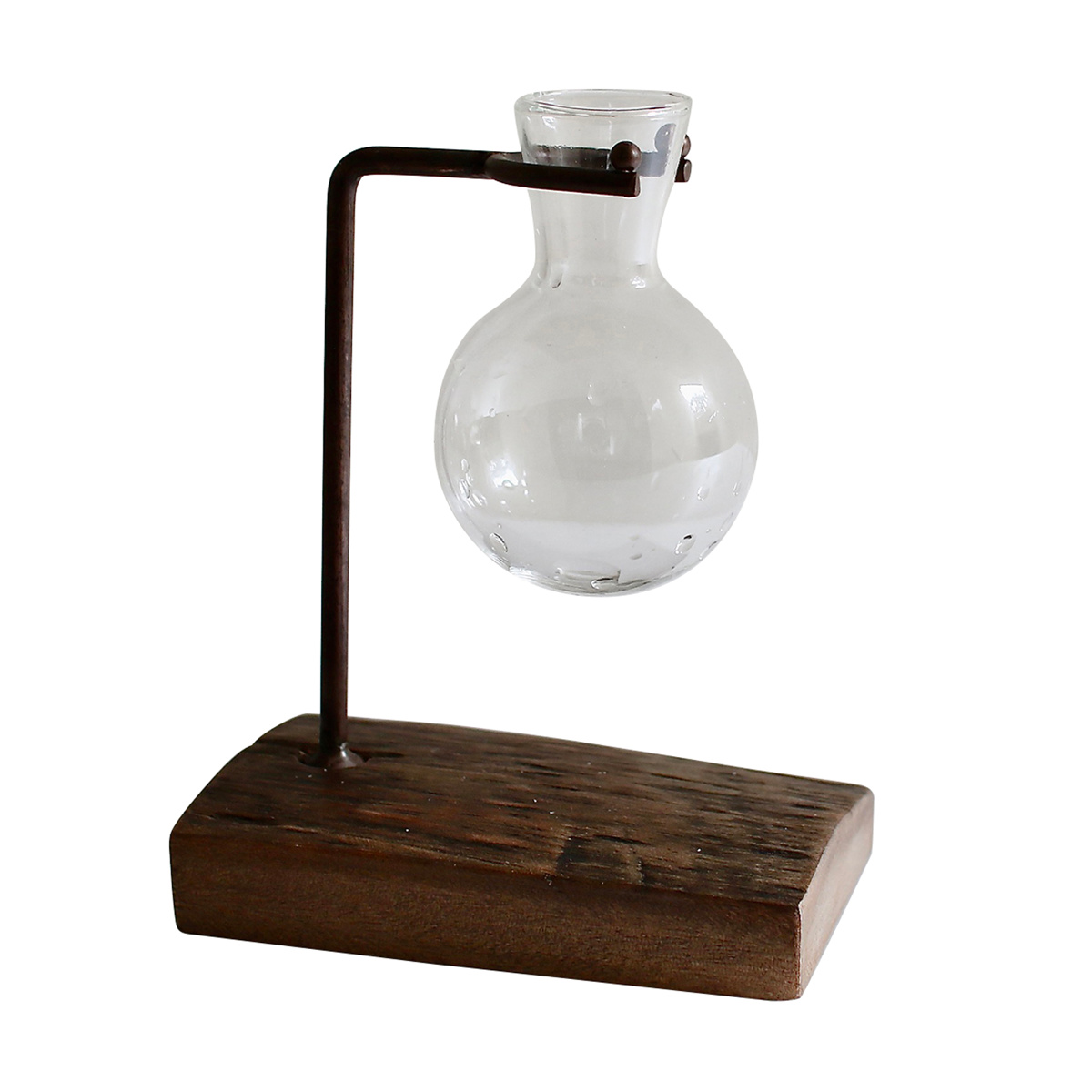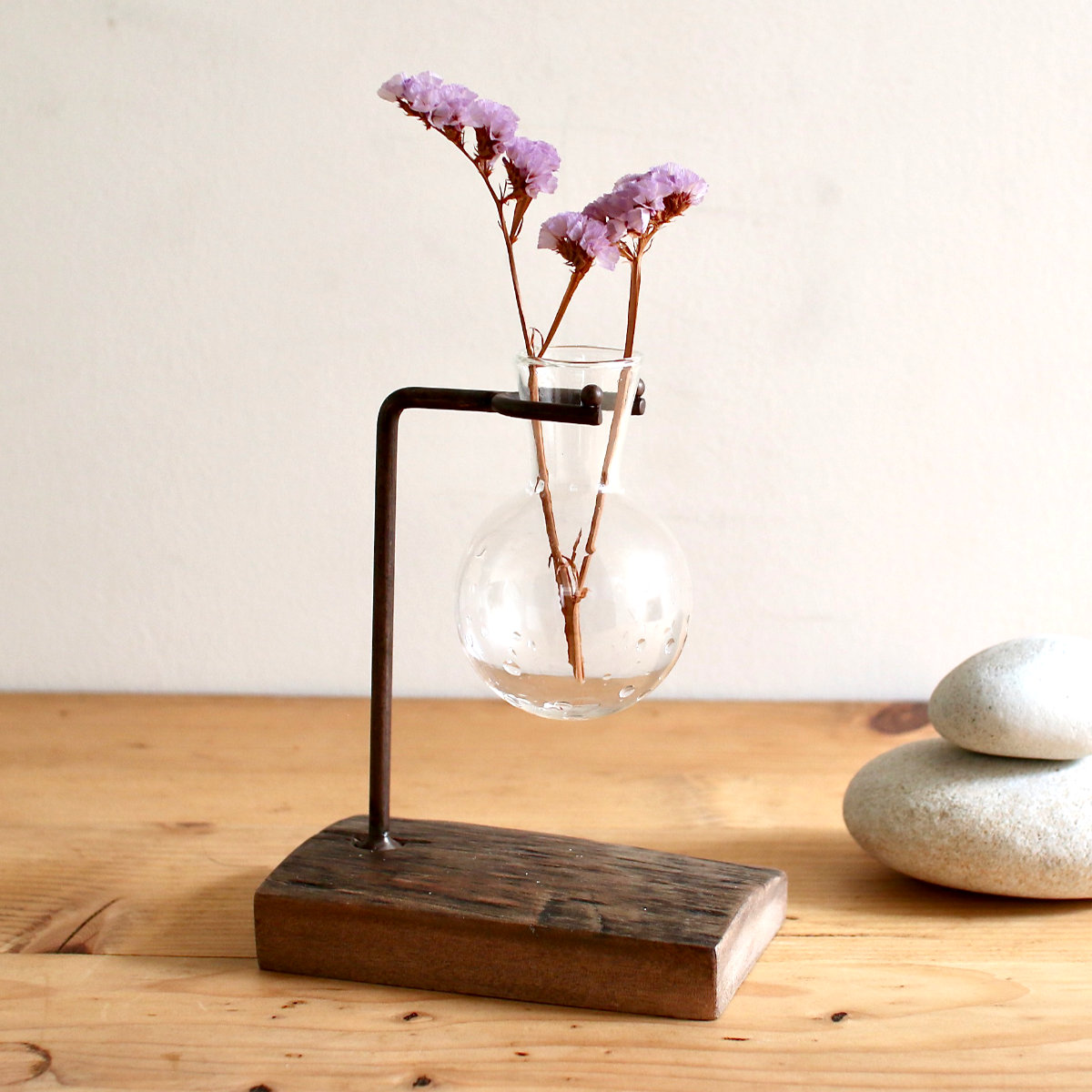 まるで実験のフラスコのように、ガラスが宙に浮いたデザインのフラワーベースです。インテリアにさりげないアクセントをくわえ、シンプルながらも洗練された空間を演出します。ガラス部分はお花を一輪挿すだけで雰囲気が変わり、ドライフラワーやグリーンとの相性も抜群です。
