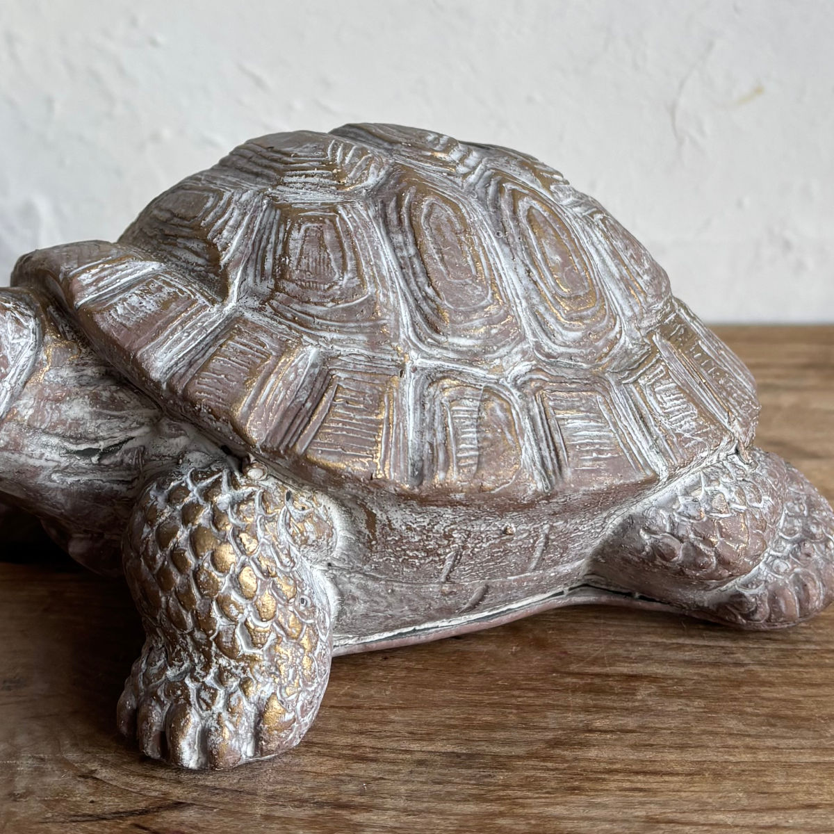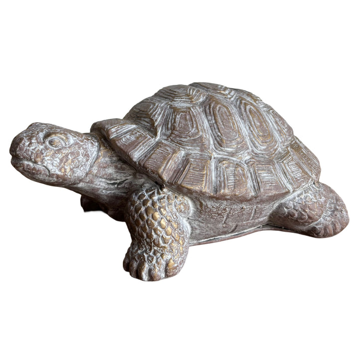 縁起物(長寿・安定・幸運)としても親しまれるカメをモチーフにしたガーデンオーナメントです。セメントならではの重厚感とアンティーク調のゴールドの風合いが、ナチュラルで落ち着いた存在感を演出します。