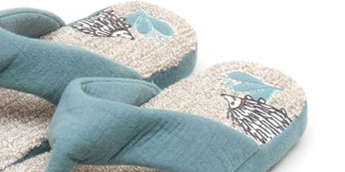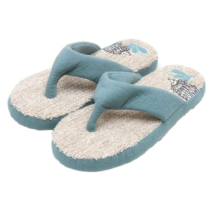 ●葉っぱの上で楽しそうなはりねずみがかわいらしい、鼻緒スリッパです。