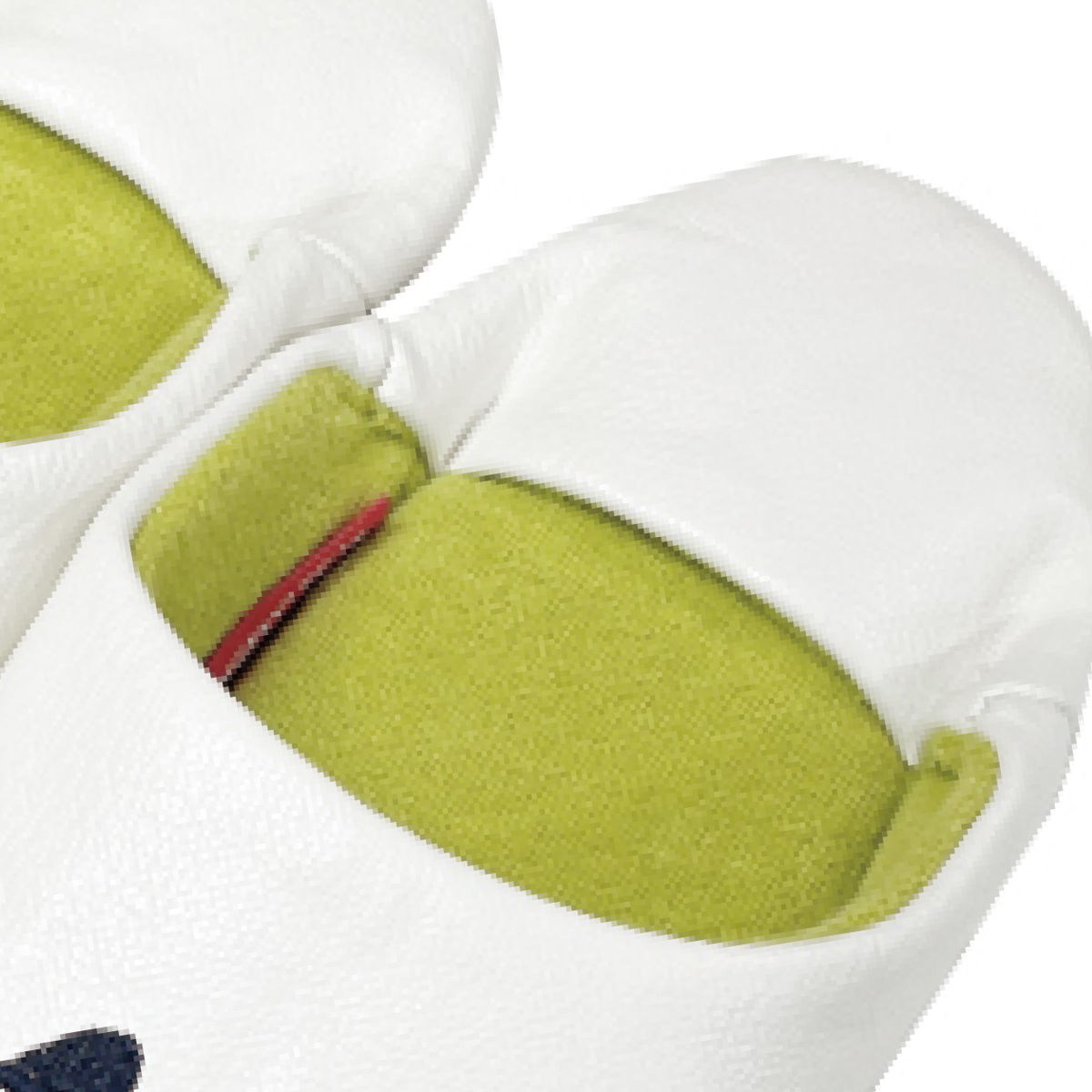 鮮やかなカラーの中敷きは、吸水性に優れたパイル地でやさしい肌あたり。かかと部分が縫い付けてあるので、スムーズに履けます。底面は静音性に優れたポリエステルスウェード素材で、かかと部分にすべり止めのパッチ付きです。