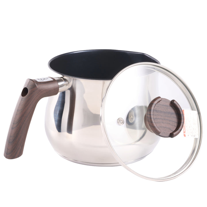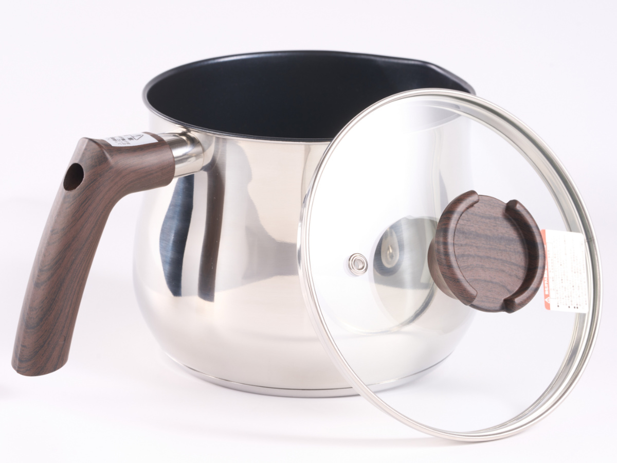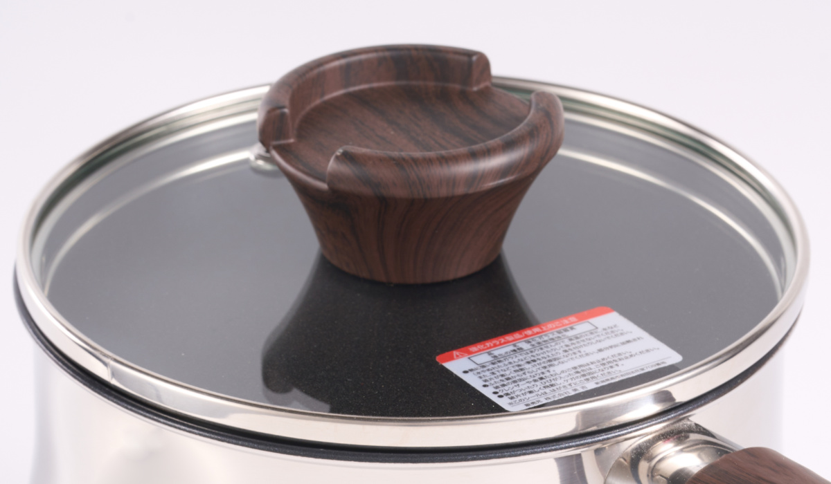 | 材質 | 本体:ステンレス鋼(クロム18%、ニッケル8%) 内面:ふっ素樹脂加工 外面:焼付塗装 底面:ステンレス鋼(クロム16%) ハンドル:フェノール樹脂(シリコン塗装) ガラス蓋:強化ガラス |