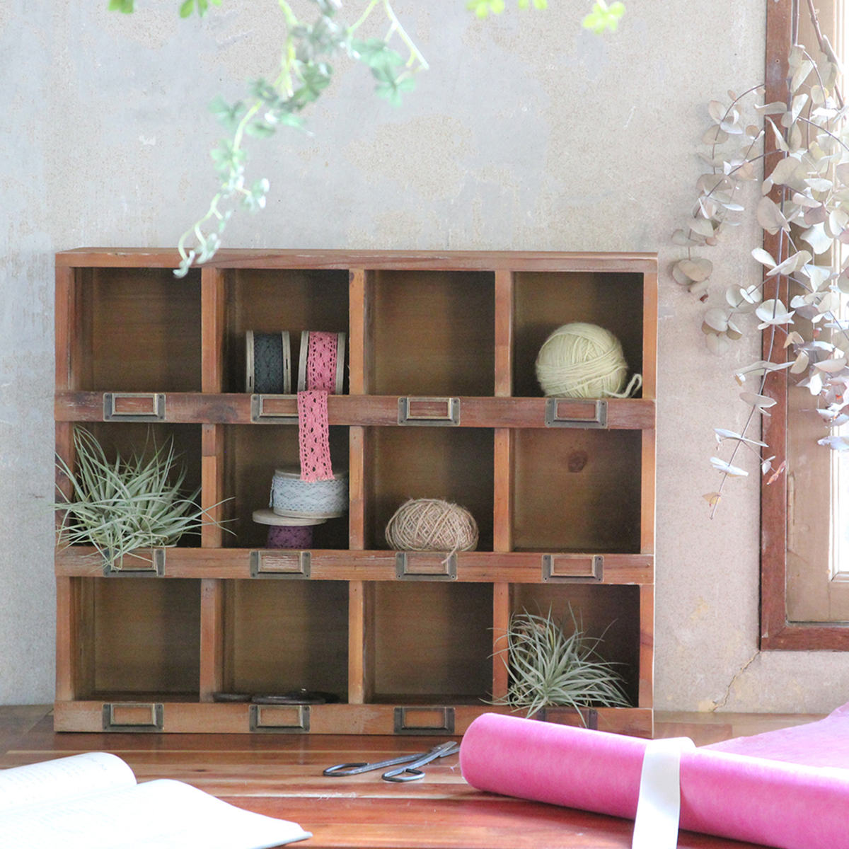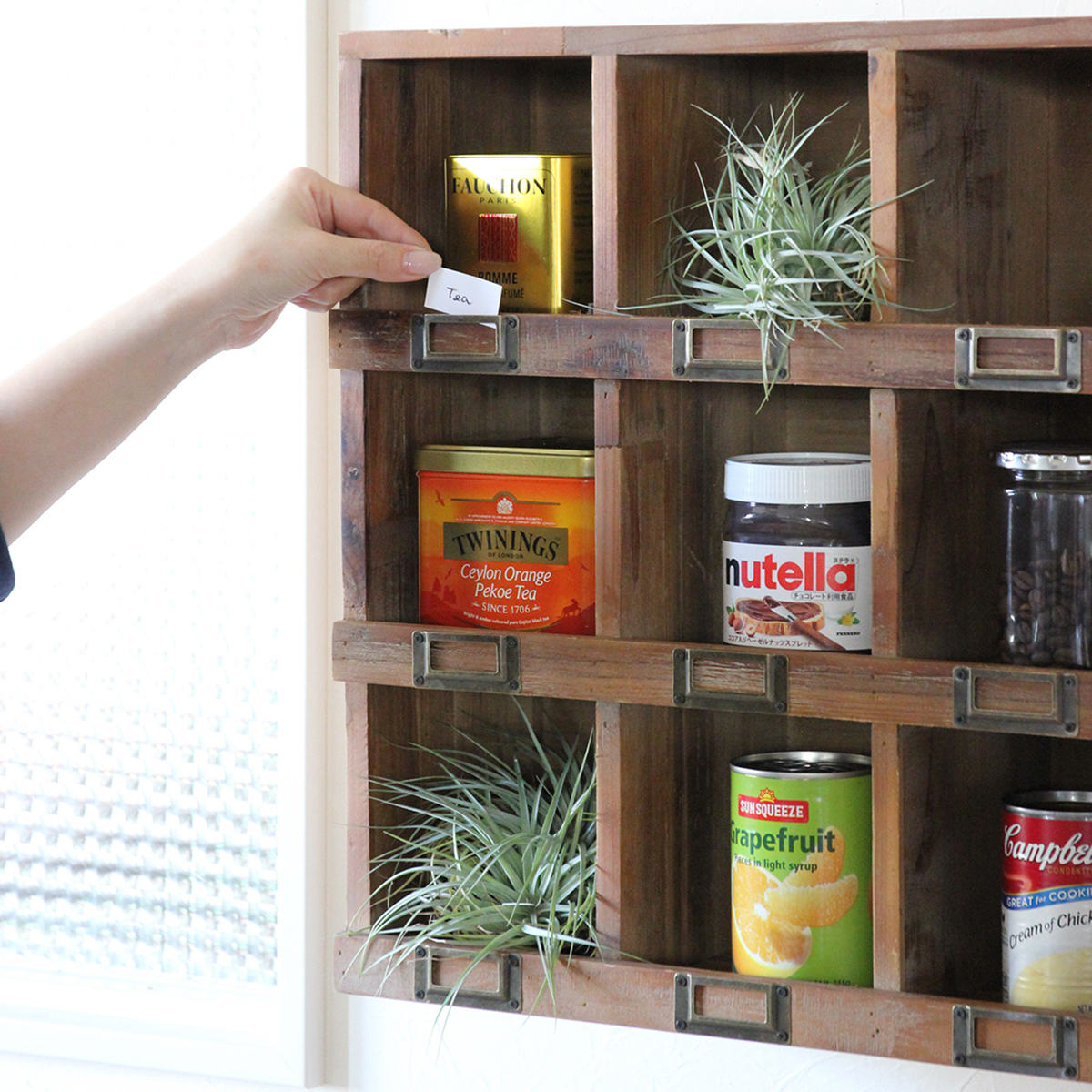 4列×3段の12マス構造で、ひとつひとつにラベルフレームが付いており、小物の整理やディスプレイに役立ちます。