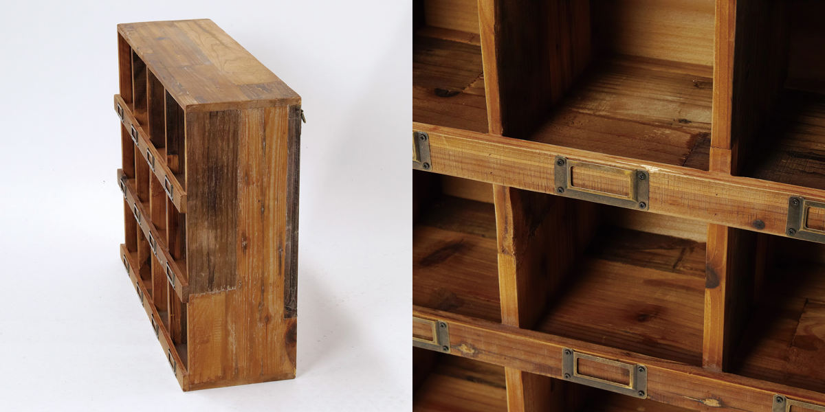 モミの木の古材を使用したアンティーク風コレクションボックスです。古材特有のどこか懐かしい雰囲気で、温もりを感じます。ひとつひとつ異なる木目や節が、時間を刻んだ味わいを醸し出し、空間に深みを与えます。