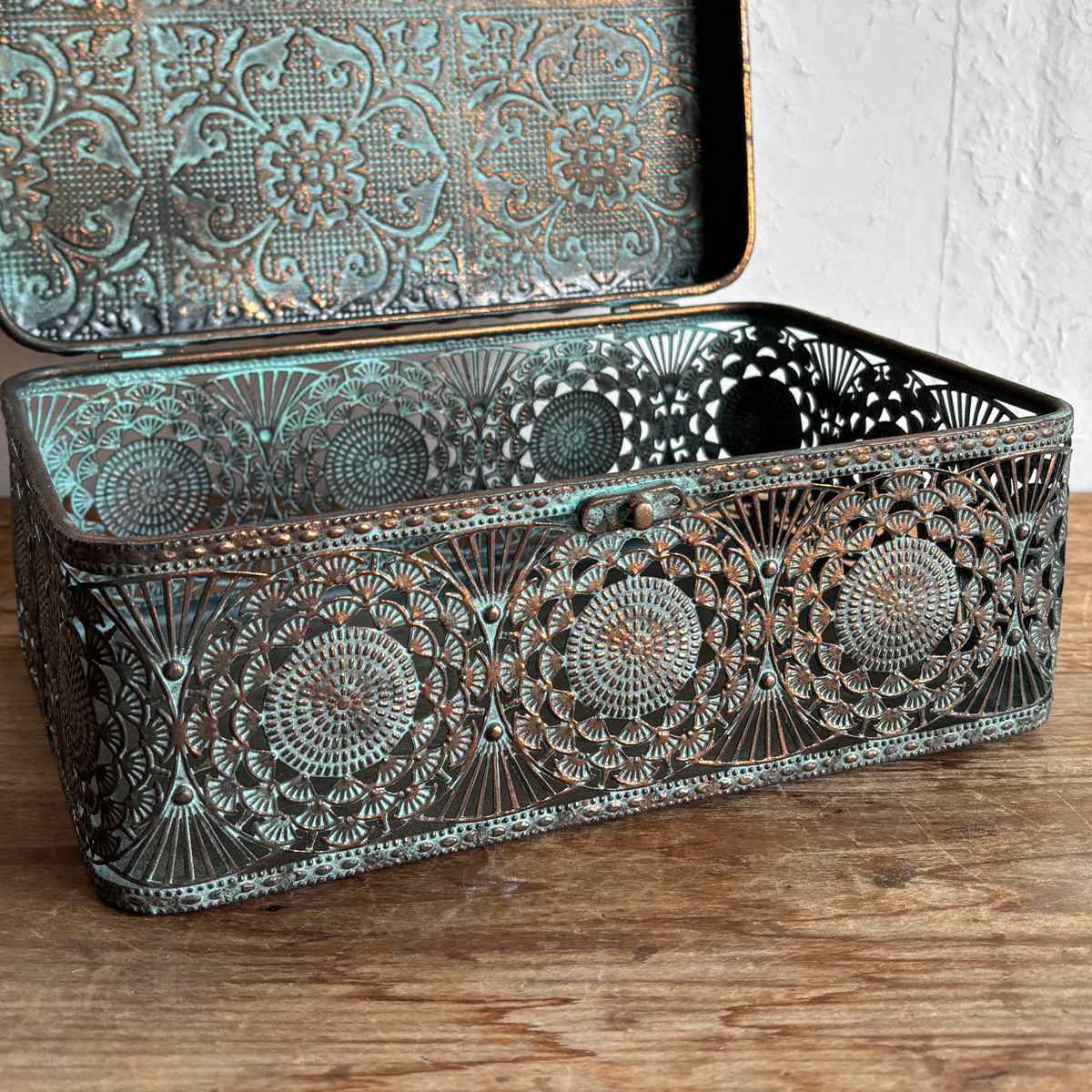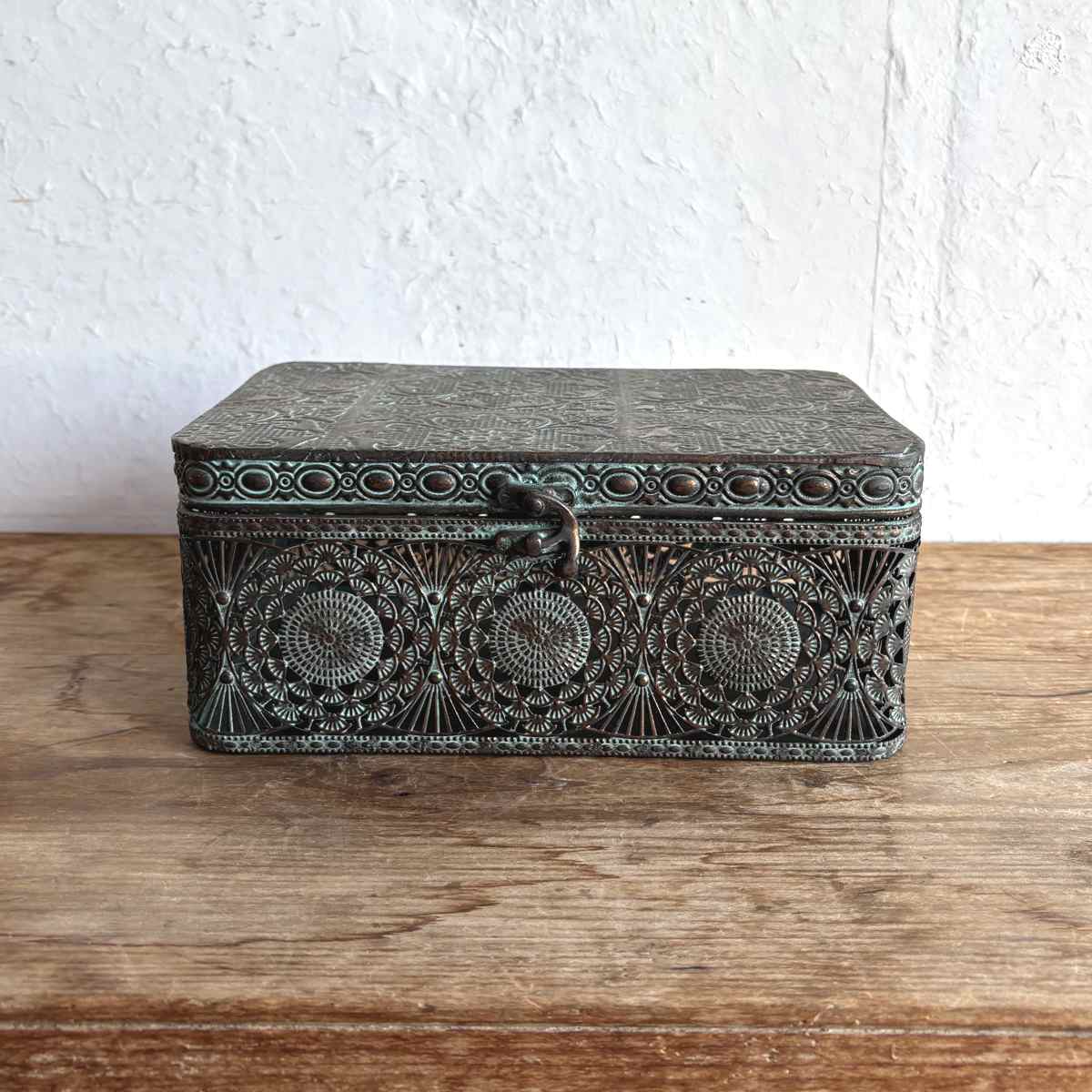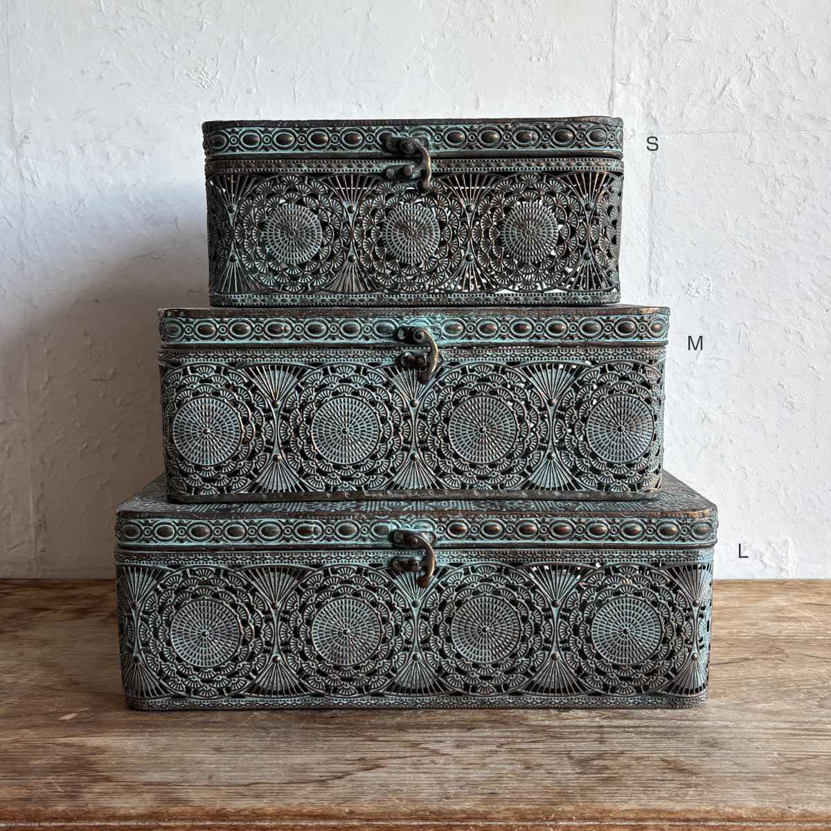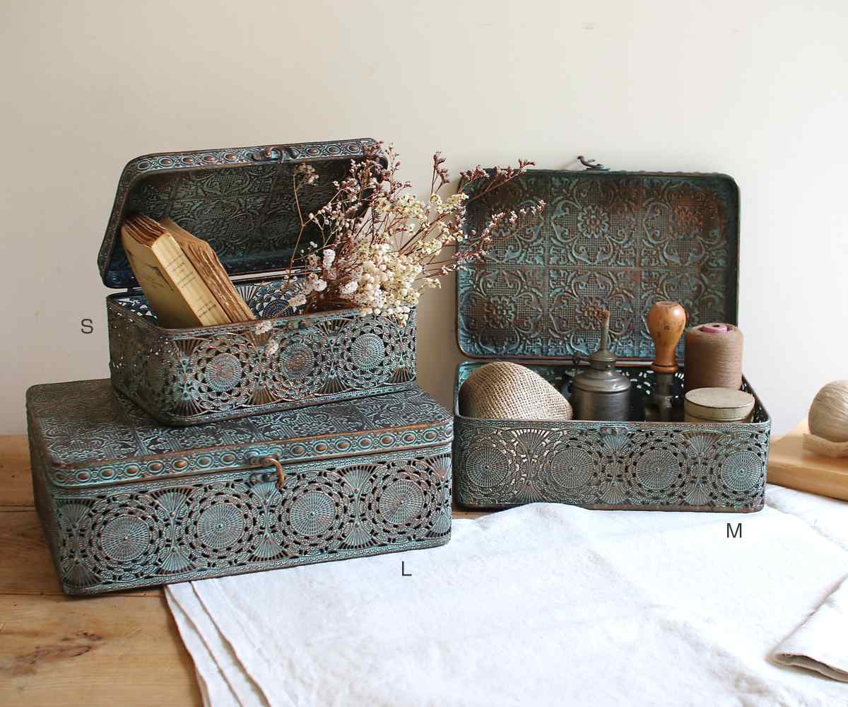 繊細なレース模様が施されたブリキ製の収納ボックスです。塗装のムラやサビ感など、ブリキならではの風合いが、味わい深い仕上がりになっています。アンティークな雰囲気で、置いておくだけで特別感のある空間を演出できます。
